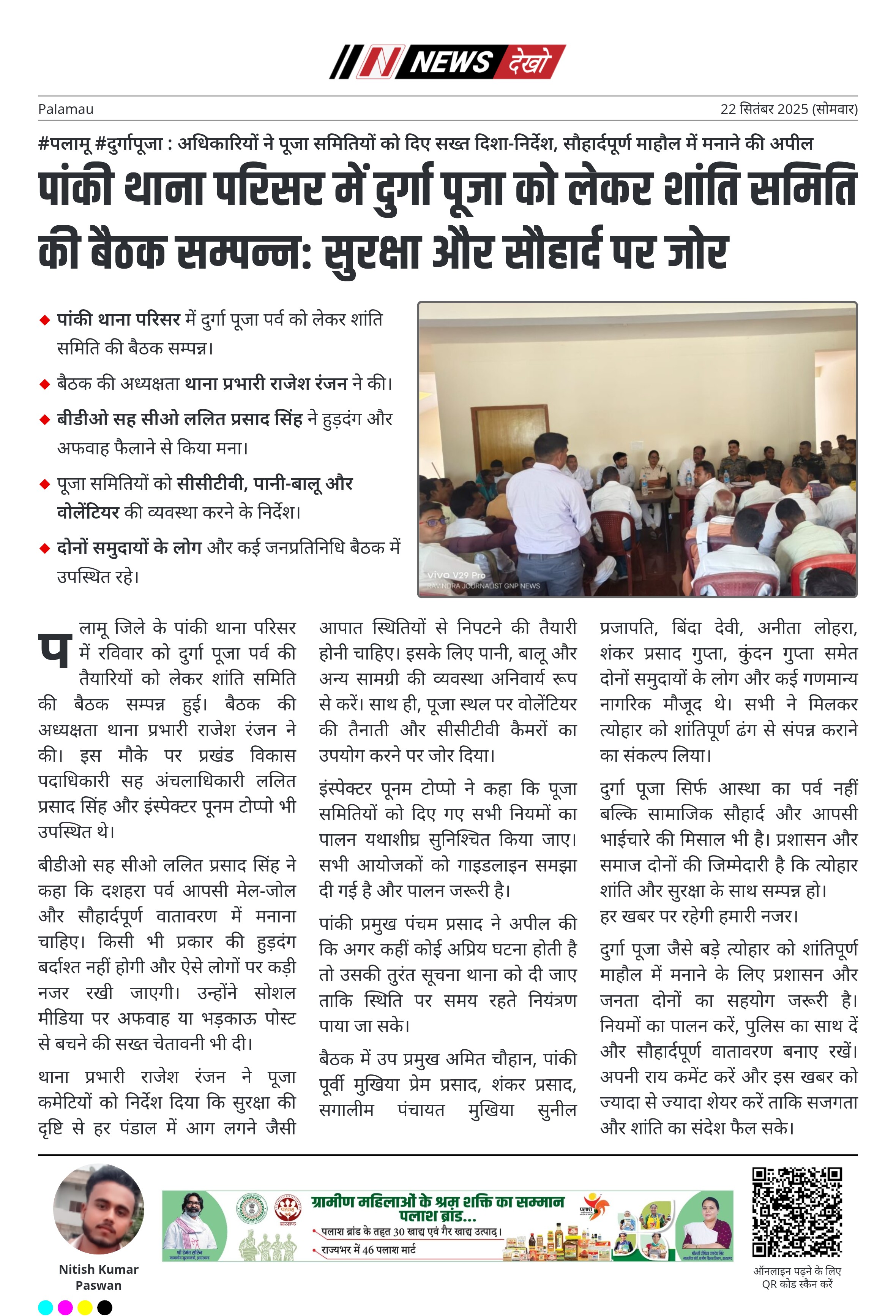 #पलामू #दुर्गापूजा : अधिकारियों ने पूजा समितियों को दिए सख्त दिशा-निर्देश, सौहार्दपूर्ण माहौल में मनाने की अपील पांकी थाना परिसर में दुर्गा पूजा पर्व को लेकर शांति समिति की बैठक सम्पन्न। बैठक की अध्यक्षता थाना प्रभारी राजेश रंजन ने की। बीडीओ सह सीओ ललित प्रसाद सिंह ने हुड़दंग और अफवाह फैलाने से किया मना। पूजा समितियों को सीसीटीवी, पानी-बालू और वोलेंटियर की व्यवस्था करने के निर्देश। दोनों समुदायों के लोग और कई जनप्रतिनिधि बैठक में उपस्थित रहे। पलामू जिले के…