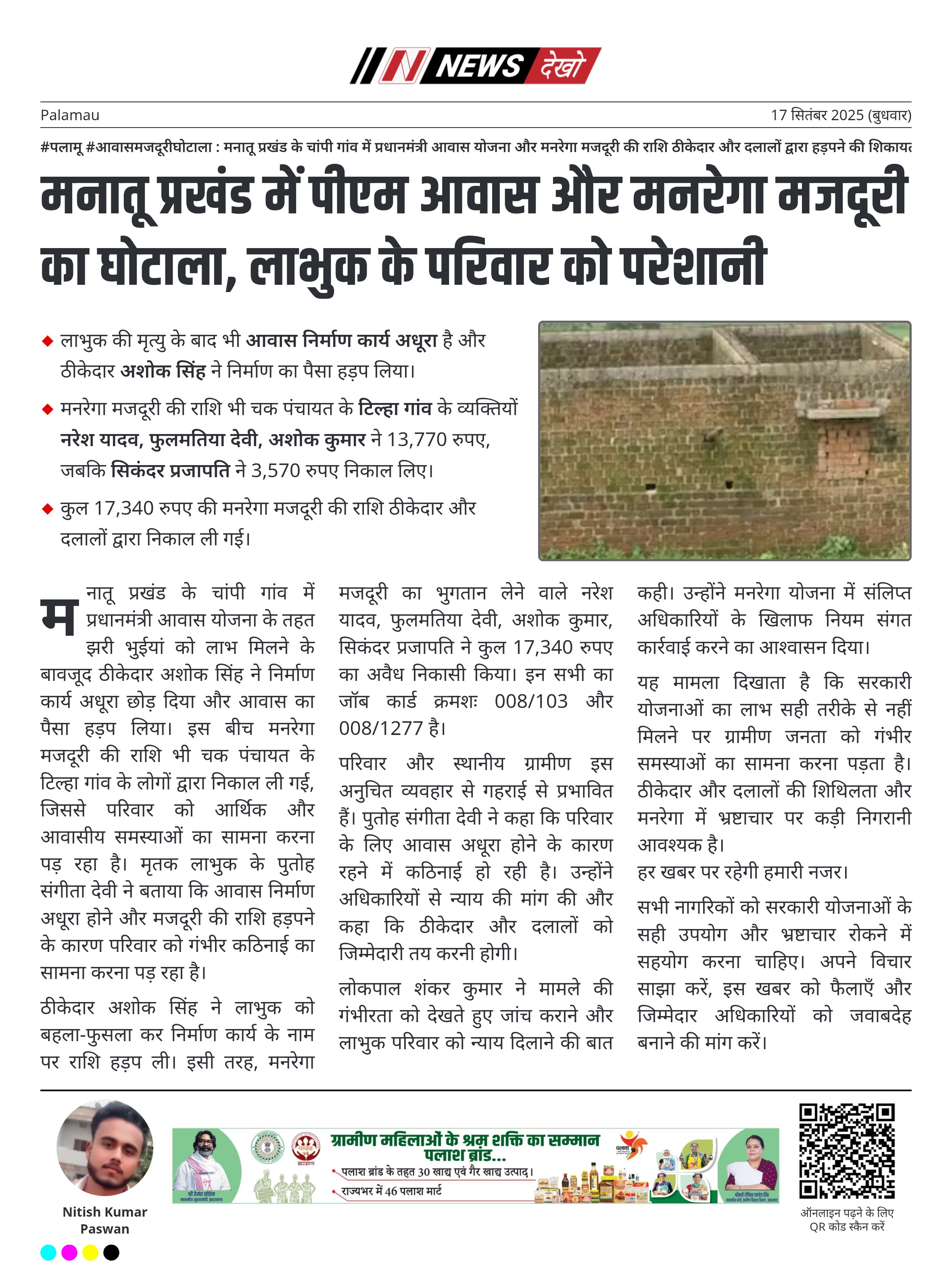 #पलामू #आवासमजदूरीघोटाला : मनातू प्रखंड के चांपी गांव में प्रधानमंत्री आवास योजना और मनरेगा मजदूरी की राशि ठीकेदार और दलालों द्वारा हड़पने की शिकायत चांपी गांव के निवासी झरी भुईयां को वर्ष 2018-19 में प्रधानमंत्री आवास योजना का लाभ मिला, जिसका PM ID JH2235144 है। लाभुक की मृत्यु के बाद भी आवास निर्माण कार्य अधूरा है और ठीकेदार अशोक सिंह ने निर्माण का पैसा हड़प लिया। मनरेगा मजदूरी की राशि भी चक पंचायत के टिल्हा गांव के व्यक्तियों नरेश यादव,…