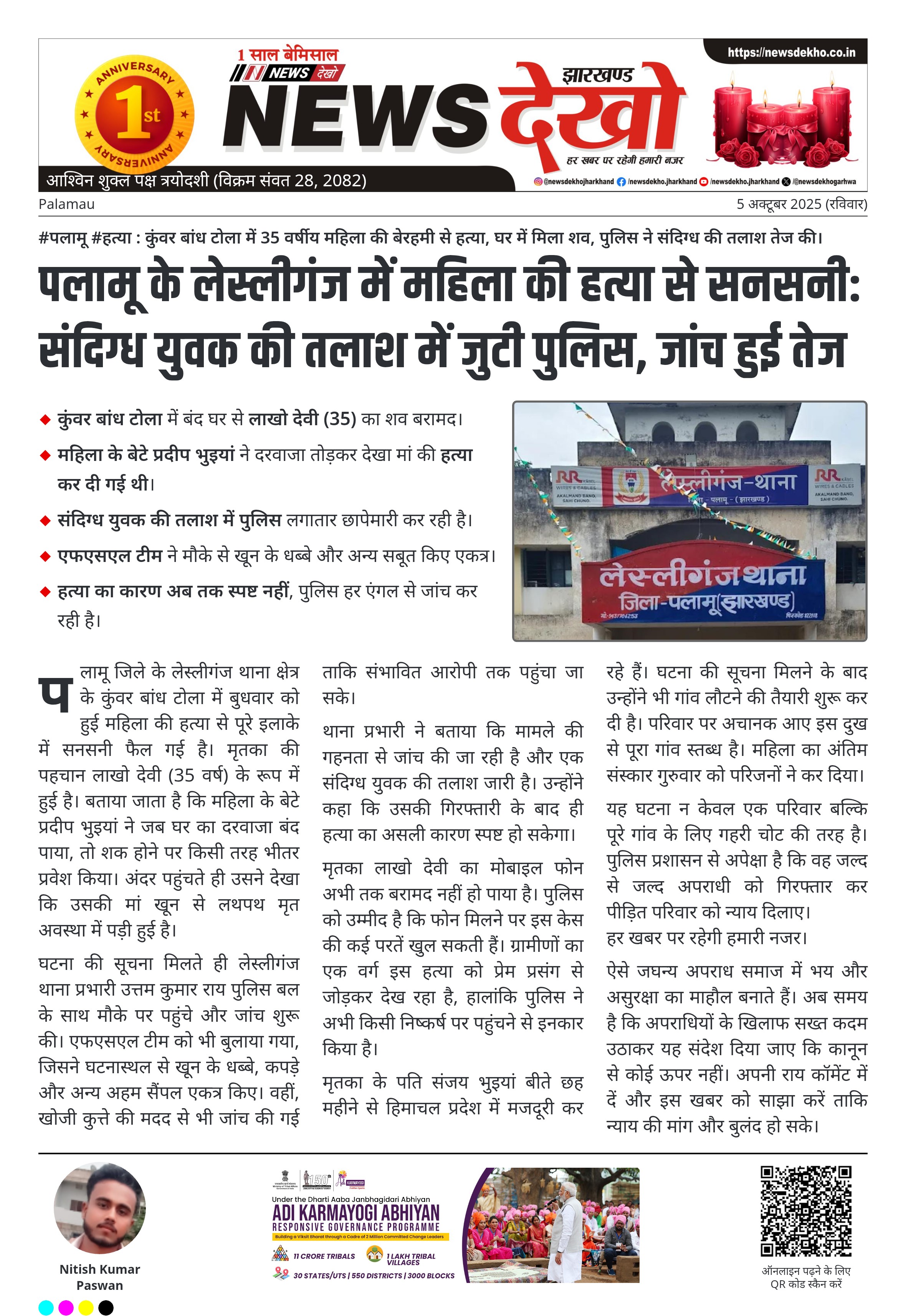 #पलामू #हत्या_कांड : लेस्लीगंज थाना क्षेत्र में लाखों देवी की बेरहमी से हत्या के मामले में आरोपी संदीप कुमार को पुलिस ने राँची रेलवे स्टेशन से गिरफ्तार कर न्यायालय में पेश किया। हत्या की घटना: लाखों देवी उम्र लगभग 35 वर्ष की बेरहमी से हत्या। गिरफ्तार अभियुक्त: संदीप कुमार उम्र 26 वर्ष, पिता स्व० प्रफुल राम, निवासी सांगबार (कुंवर बांध)। घटना का समय: दिनांक-30.09.2025 रात। अभियुक्त द्वारा स्वीकारोक्ति: हत्या के बाद शव के साक्ष्य और मोबाइल को पास के सुखा…