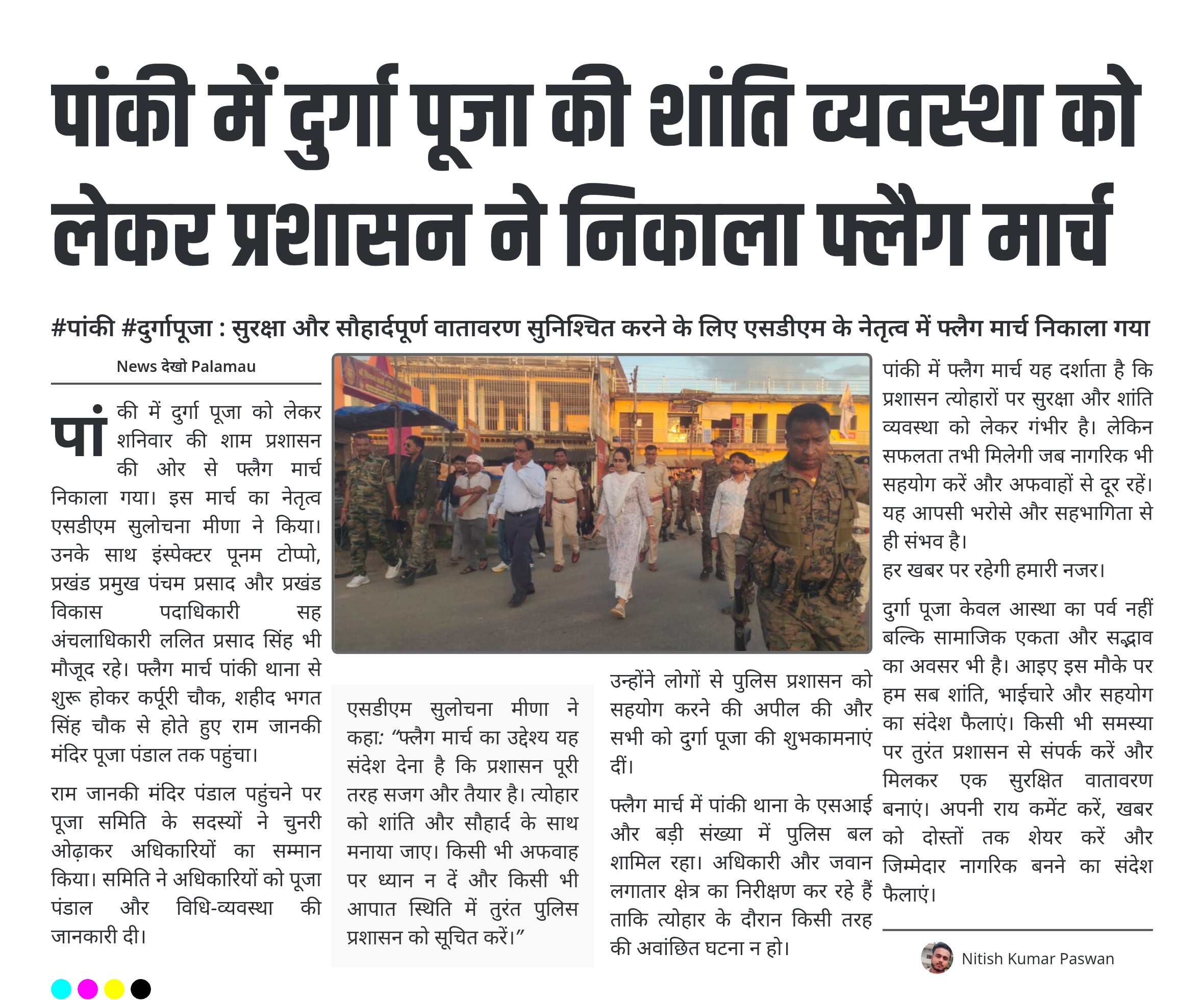 #पांकी #दुर्गापूजा : सुरक्षा और सौहार्दपूर्ण वातावरण सुनिश्चित करने के लिए एसडीएम के नेतृत्व में फ्लैग मार्च निकाला गया पांकी में दुर्गा पूजा को लेकर प्रशासन पूरी तरह मुस्तैद। एसडीएम सुलोचना मीणा के नेतृत्व में निकाला गया फ्लैग मार्च। मार्च में इंस्पेक्टर पूनम टोप्पो, प्रखंड प्रमुख पंचम प्रसाद और अन्य अधिकारी शामिल। राम जानकी मंदिर पूजा पंडाल पहुंचकर समिति ने अधिकारियों का सम्मान किया। एसडीएम ने कहा अफवाहों पर ध्यान न दें, पुलिस को तुरंत सूचना दें। पुलिस बल और…