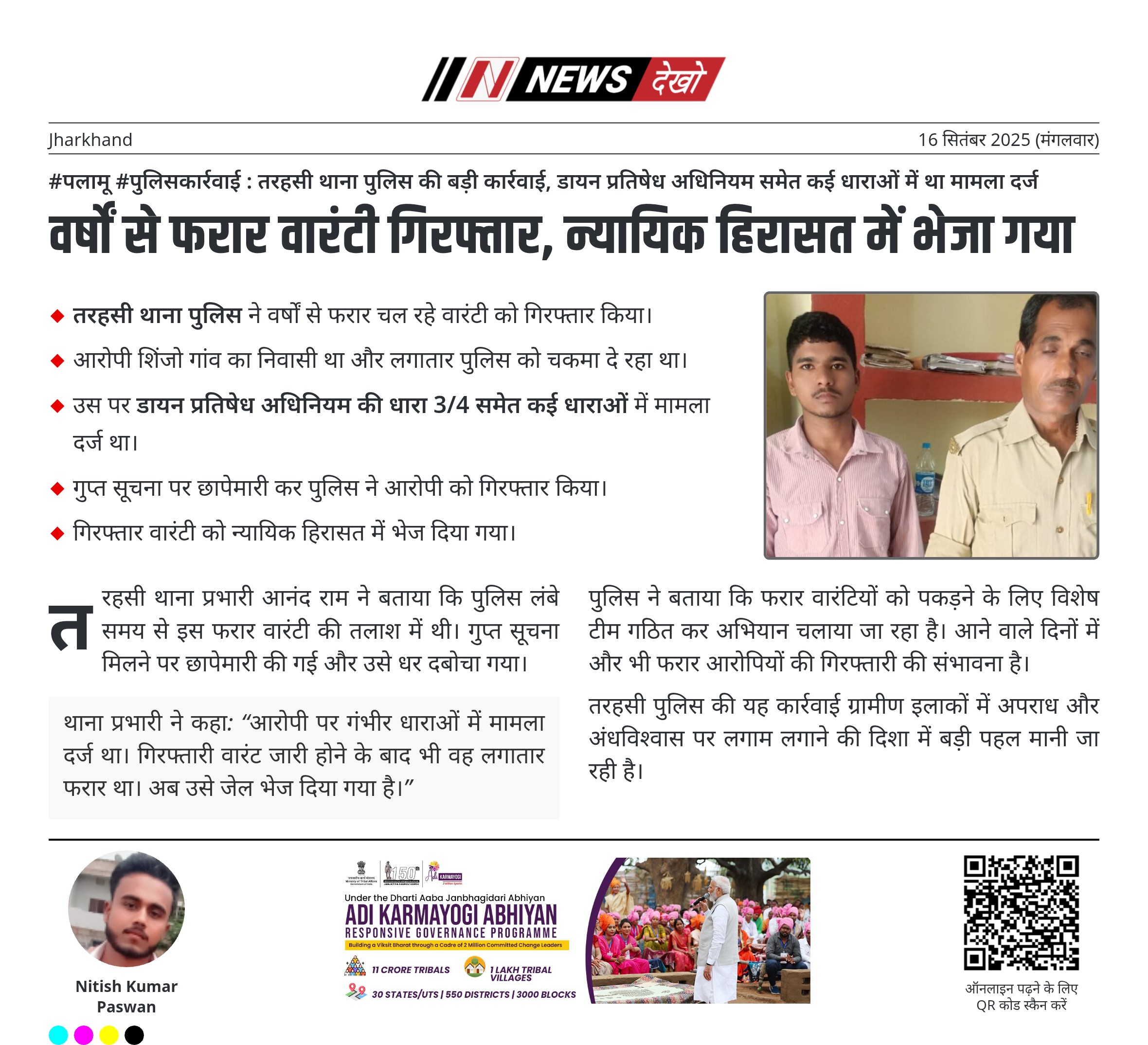 #पलामू #पुलिसकार्रवाई : तरहसी थाना पुलिस की बड़ी कार्रवाई, डायन प्रतिषेध अधिनियम समेत कई धाराओं में था मामला दर्ज तरहसी थाना पुलिस ने वर्षों से फरार चल रहे वारंटी को गिरफ्तार किया। आरोपी शिंजो गांव का निवासी था और लगातार पुलिस को चकमा दे रहा था। उस पर डायन प्रतिषेध अधिनियम की धारा 3/4 समेत कई धाराओं में मामला दर्ज था। गुप्त सूचना पर छापेमारी कर पुलिस ने आरोपी को गिरफ्तार किया। गिरफ्तार वारंटी को न्यायिक हिरासत में भेज दिया…