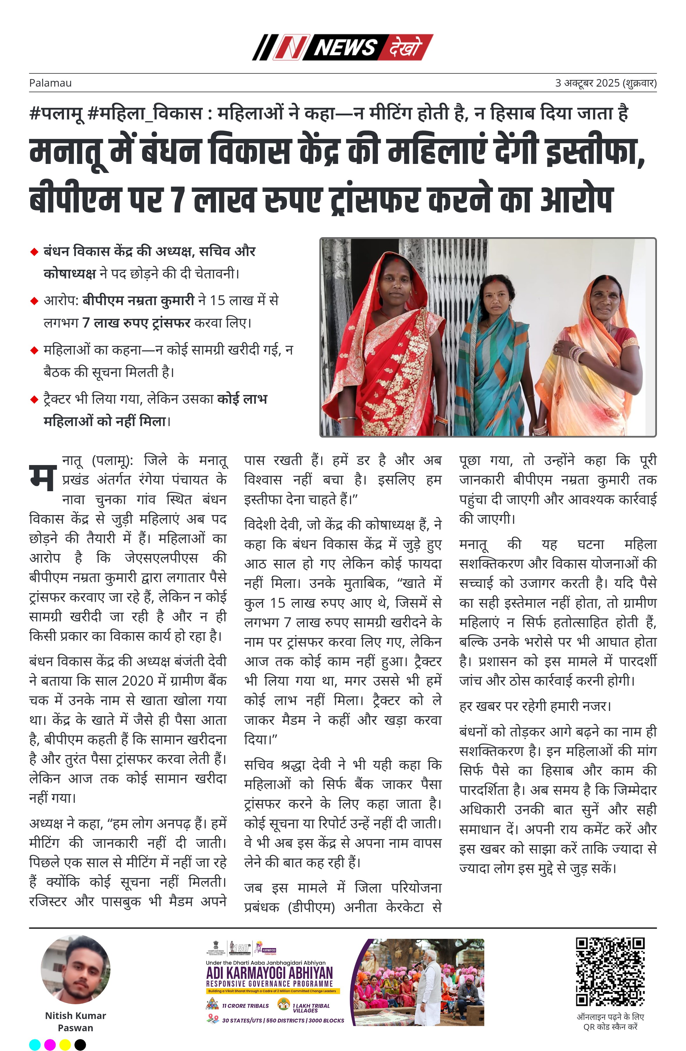 #पलामू #महिला_विकास : महिलाओं ने कहा—न मीटिंग होती है, न हिसाब दिया जाता है बंधन विकास केंद्र की अध्यक्ष, सचिव और कोषाध्यक्ष ने पद छोड़ने की दी चेतावनी। आरोप: बीपीएम नम्रता कुमारी ने 15 लाख में से लगभग 7 लाख रुपए ट्रांसफर करवा लिए। महिलाओं का कहना—न कोई सामग्री खरीदी गई, न बैठक की सूचना मिलती है। ट्रैक्टर भी लिया गया, लेकिन उसका कोई लाभ महिलाओं को नहीं मिला। डीपीएम अनीता केरकेटा ने कहा—बीपीएम को मामले से अवगत करा दिया…