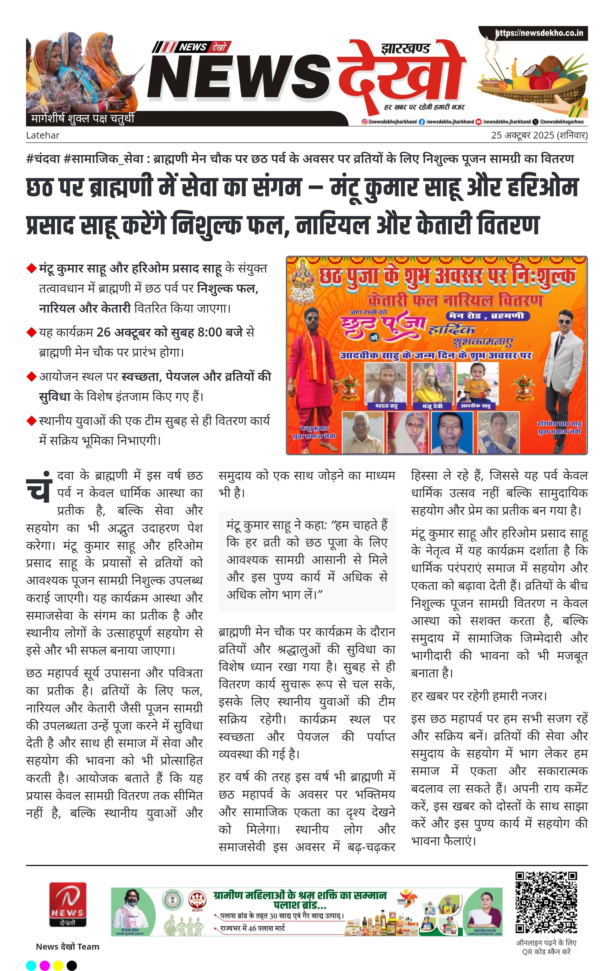 #मेदिनीनगर #छठपर्व : जरूरतमंद व्रतियों के बीच साड़ी, फल, नारियल और पूजा सामग्री का वितरण वरदान चैरिटेबल ट्रस्ट का तीन दिवसीय महा अभियान आज संपन्न हुआ। छठ महापर्व पर हर साल की तरह इस वर्ष भी जरूरतमंद व्रतियों को सामग्री वितरण किया गया। नहाय-खाय, खरना और घाट दिवस तक सूती साड़ी, फल, नारियल, घी, अगरबत्ती, कपूर, गमछा, धोती वितरित किए गए। संस्था की सचिव शर्मिला वर्मा ने कहा कि “यह सेवा हमारी श्रद्धा का प्रतीक है।” अभियान में विवेक वर्मा,…