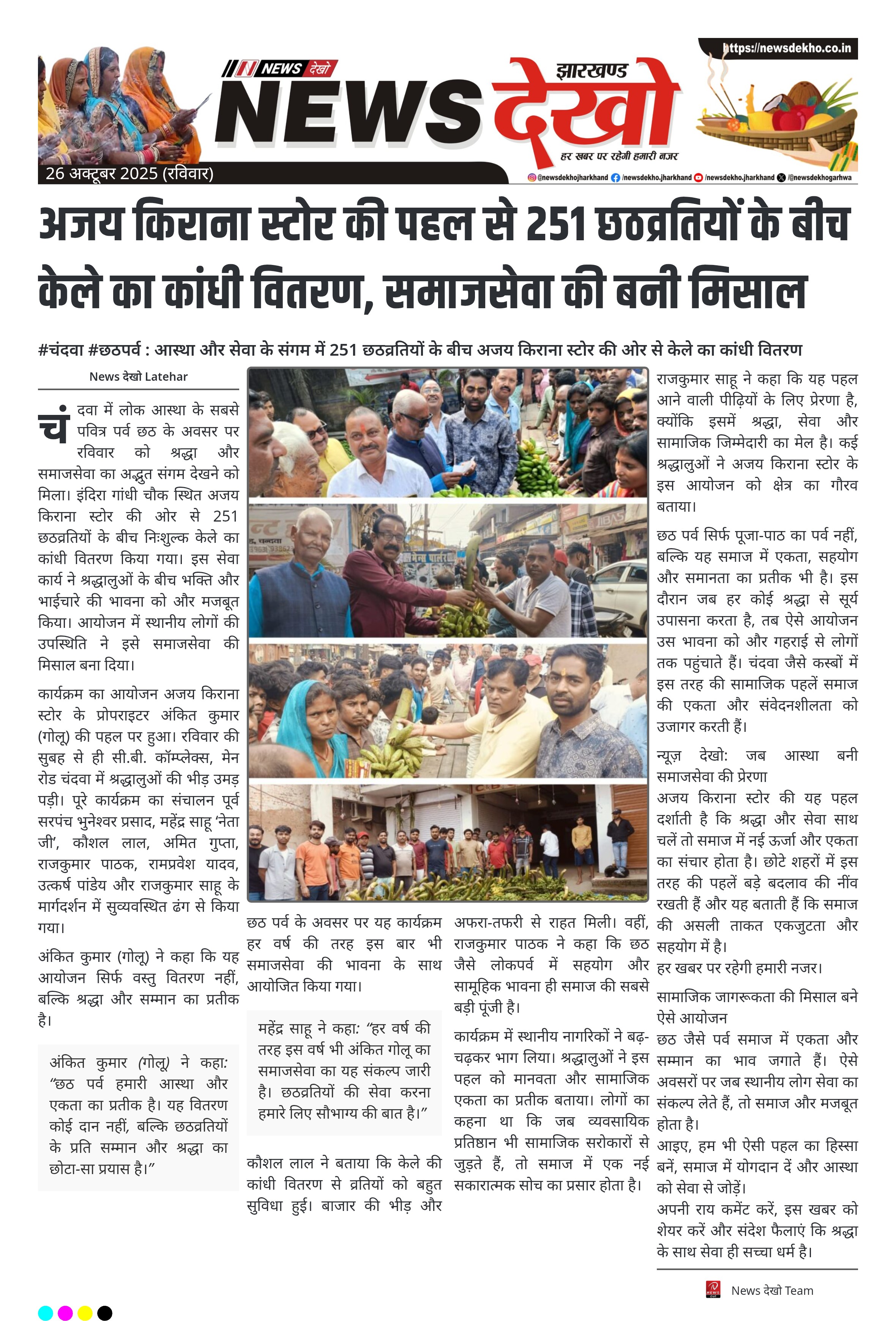 #चंदवा #छठपर्व : आस्था और सेवा के संगम में 251 छठव्रतियों के बीच अजय किराना स्टोर की ओर से केले का कांधी वितरण लोक आस्था के महापर्व छठ पर अजय किराना स्टोर की ओर से सराहनीय पहल। 251 छठव्रतियों को निःशुल्क केले का कांधी वितरण किया गया। कार्यक्रम महेंद्र साहू ‘नेता जी’ के सी.बी. कॉम्प्लेक्स, मेन रोड चंदवा में संपन्न हुआ। अंकित कुमार (गोलू) ने कहा – “यह दान नहीं, श्रद्धा और सम्मान का प्रतीक है।” स्थानीय लोगों ने उत्साहपूर्वक…