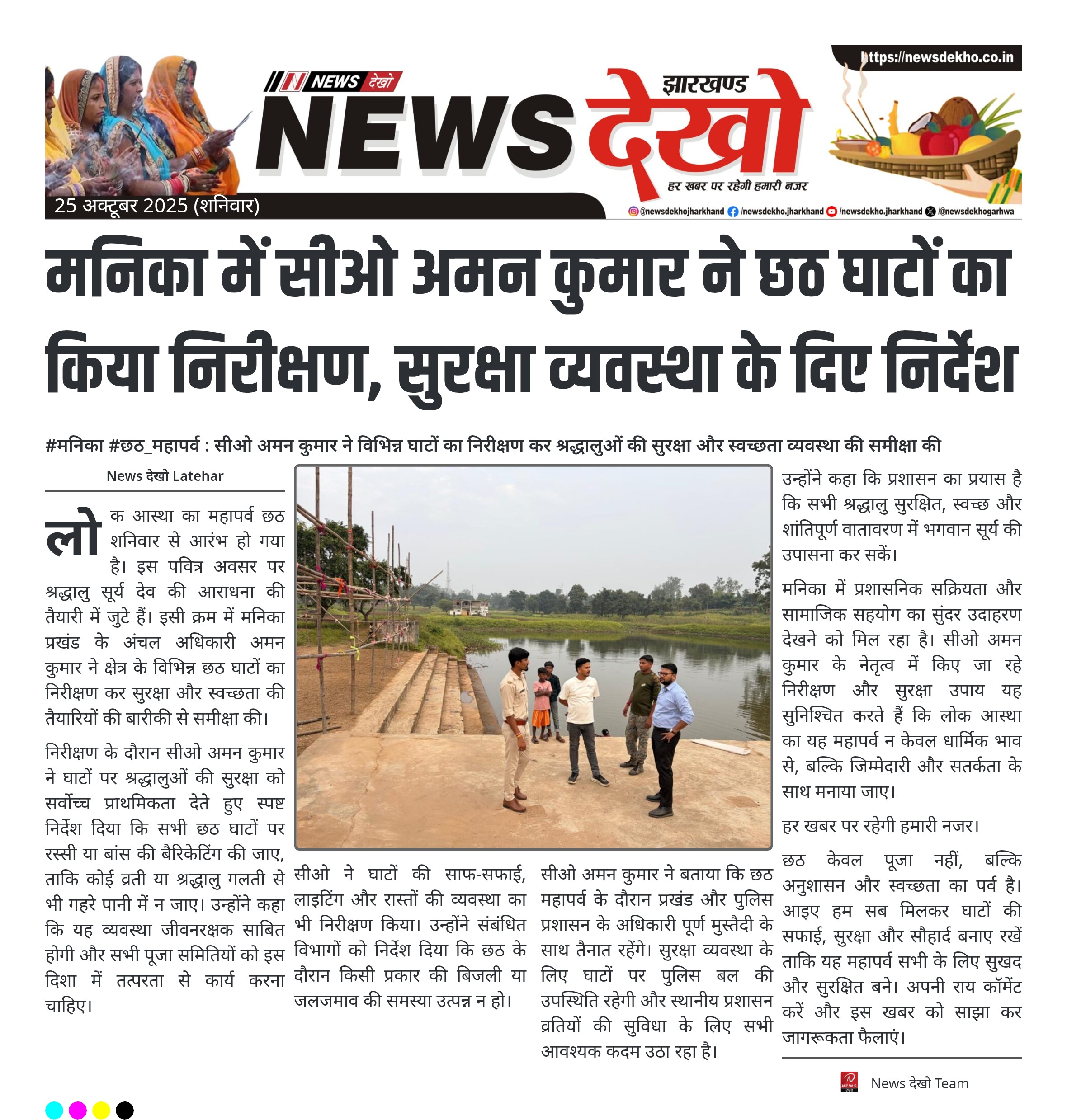 #मनिका #छठ_महापर्व : सीओ अमन कुमार ने विभिन्न घाटों का निरीक्षण कर श्रद्धालुओं की सुरक्षा और स्वच्छता व्यवस्था की समीक्षा की मनिका सीओ अमन कुमार ने शनिवार को प्रखंड क्षेत्र के कई छठ घाटों का निरीक्षण किया। उन्होंने छठ व्रतियों की सुरक्षा को ध्यान में रखते हुए घाटों पर बैरिकेटिंग करने का निर्देश दिया। सीओ ने घाटों की सफाई व्यवस्था और प्रकाश व्यवस्था का भी जायजा लिया। उन्होंने कहा कि प्रखंड और पुलिस प्रशासन पूरी मुस्तैदी से तैनात रहेगा। उद्देश्य…