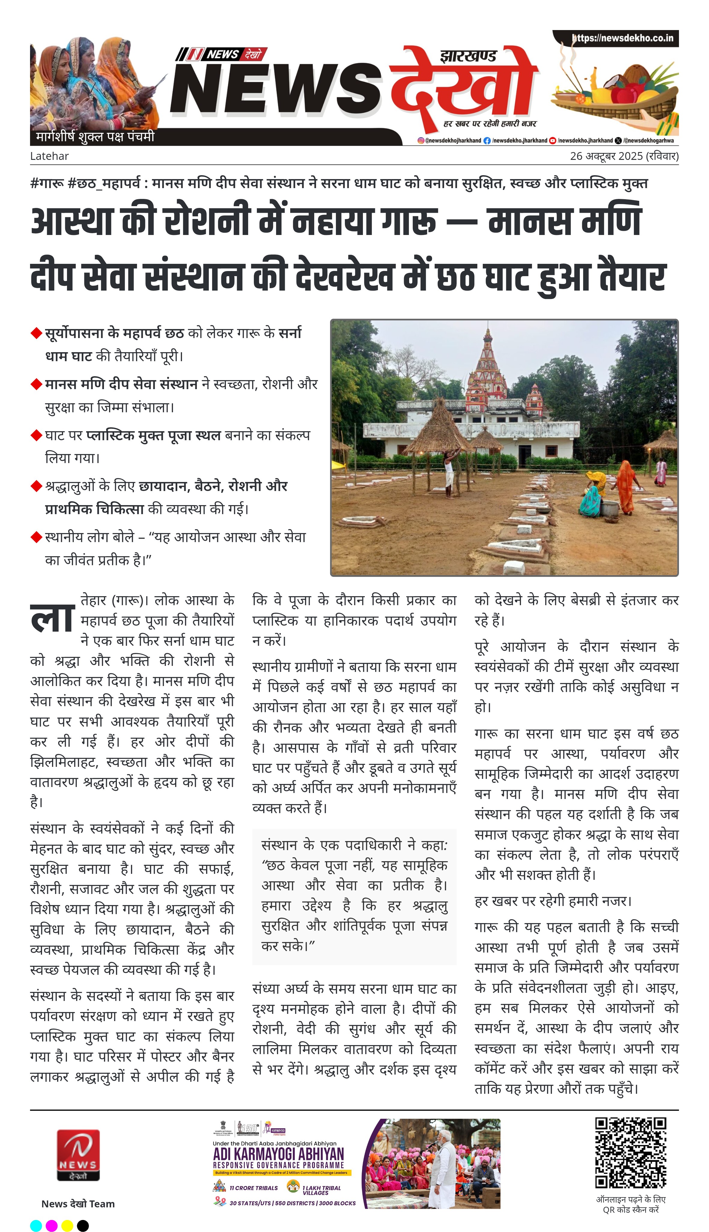 #गारू #छठ_महापर्व : मानस मणि दीप सेवा संस्थान ने सरना धाम घाट को बनाया सुरक्षित, स्वच्छ और प्लास्टिक मुक्त सूर्योपासना के महापर्व छठ को लेकर गारू के सर्ना धाम घाट की तैयारियाँ पूरी। मानस मणि दीप सेवा संस्थान ने स्वच्छता, रोशनी और सुरक्षा का जिम्मा संभाला। घाट पर प्लास्टिक मुक्त पूजा स्थल बनाने का संकल्प लिया गया। श्रद्धालुओं के लिए छायादान, बैठने, रोशनी और प्राथमिक चिकित्सा की व्यवस्था की गई। स्थानीय लोग बोले – “यह आयोजन आस्था और सेवा का…