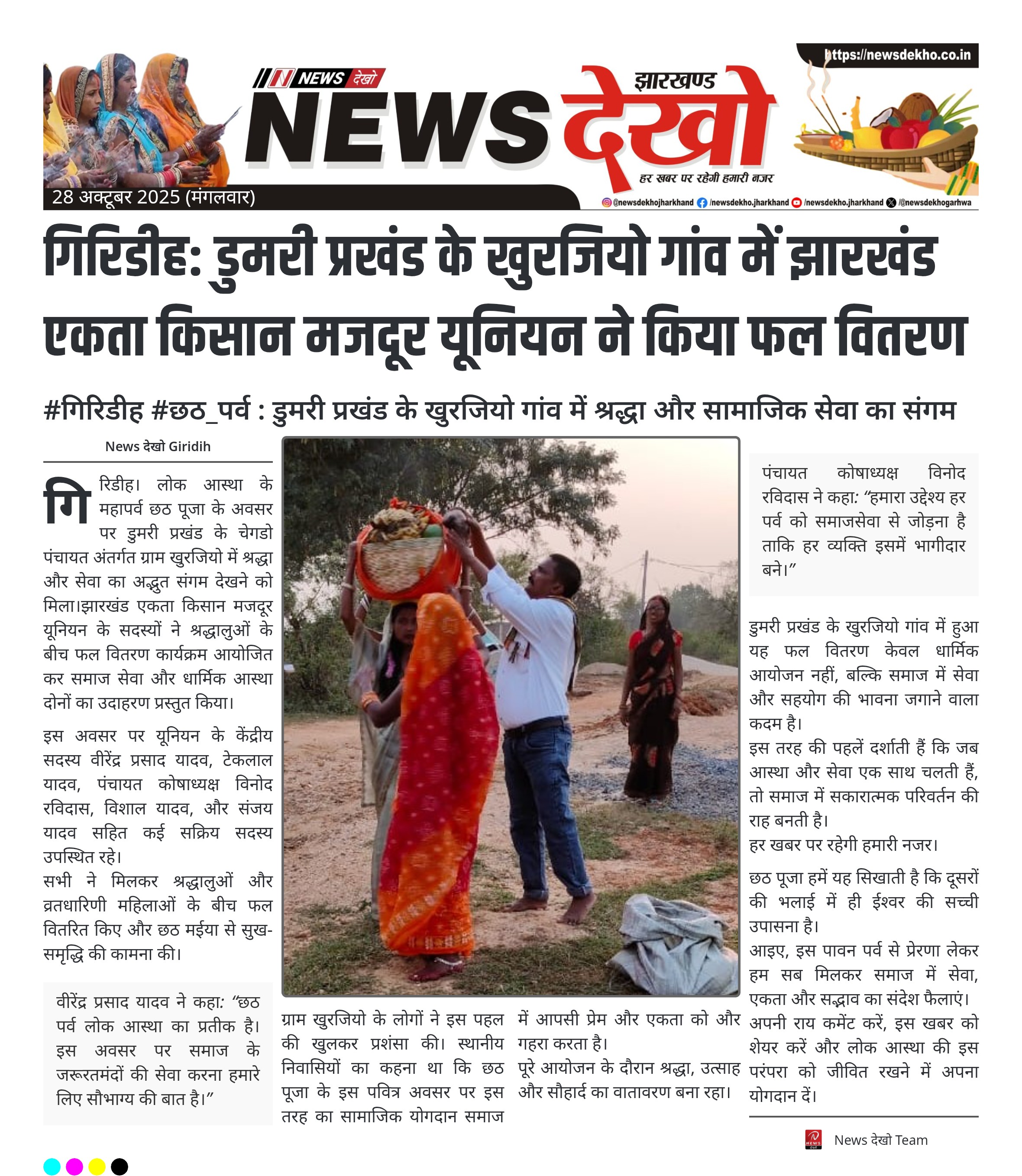 #गिरिडीह #छठ_पर्व : डुमरी प्रखंड के खुरजियो गांव में श्रद्धा और सामाजिक सेवा का संगम डुमरी प्रखंड के खुरजियो गांव में छठ पूजा के अवसर पर हुआ फल वितरण कार्यक्रम। आयोजन में झारखंड एकता किसान मजदूर यूनियन के पदाधिकारी रहे उपस्थित। केंद्रीय सदस्य वीरेंद्र प्रसाद यादव, टेकलाल यादव, कोषाध्यक्ष विनोद रविदास, विशाल यादव, और संजय यादव ने निभाई अहम भूमिका। श्रद्धालुओं के बीच फल वितरण कर जताई लोक आस्था और सामाजिक एकता की मिसाल। स्थानीय ग्रामीणों ने कार्यक्रम की सराहना…