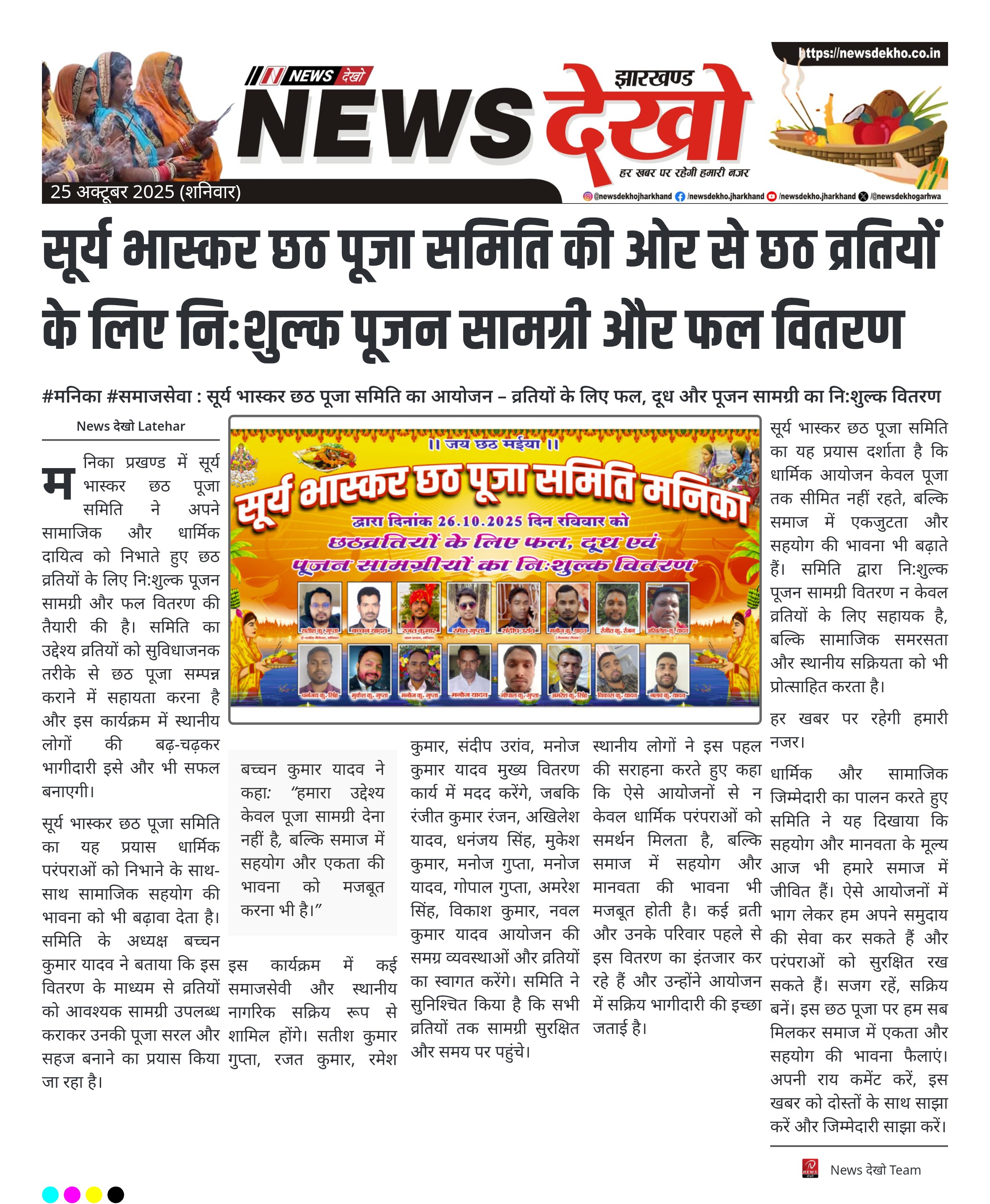 #मनिका #समाजसेवा : सूर्य भास्कर छठ पूजा समिति का आयोजन – व्रतियों के लिए फल, दूध और पूजन सामग्री का नि:शुल्क वितरण सूर्य भास्कर छठ पूजा समिति द्वारा मनिका प्रखण्ड मुख्यालय में छठ व्रतियों के लिए फल, दूध और पूजन सामग्री का नि:शुल्क वितरण किया जाएगा। यह वितरण मनोज रेडियो के घर के समीप रविवार को किया जाएगा। आयोजन की जानकारी समिति के बच्चन कुमार यादव ने दी। कार्यक्रम में सतीश कुमार गुप्ता, रजत कुमार, रमेश कुमार, संदीप उरांव, मनोज…