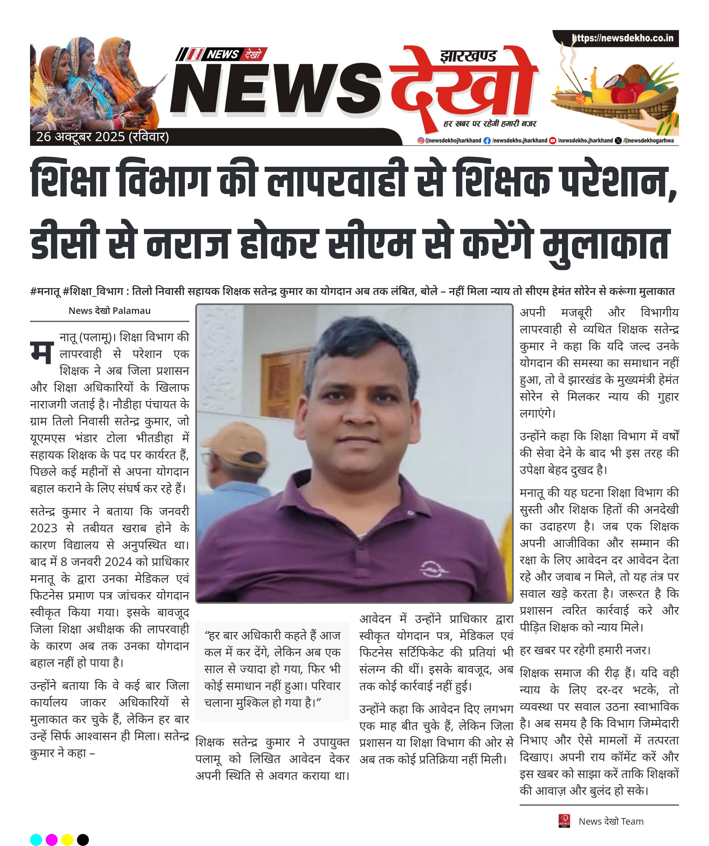 #मनातू #शिक्षा_विभाग : तिलो निवासी सहायक शिक्षक सतेन्द्र कुमार का योगदान अब तक लंबित, बोले – नहीं मिला न्याय तो सीएम हेमंत सोरेन से करूंगा मुलाकात मनातू प्रखंड के शिक्षक सतेन्द्र कुमार का योगदान एक वर्ष से लंबित पड़ा हुआ है। शिक्षक ने कहा कि डीसी को आवेदन दिए एक माह बीत गए, लेकिन अब तक कोई कार्रवाई नहीं हुई। शिक्षा अधीक्षक पर लगाया टालमटोल का आरोप, बोले – “हर बार आज-कल कहकर टाल देते हैं।” शिक्षक ने कहा कि…