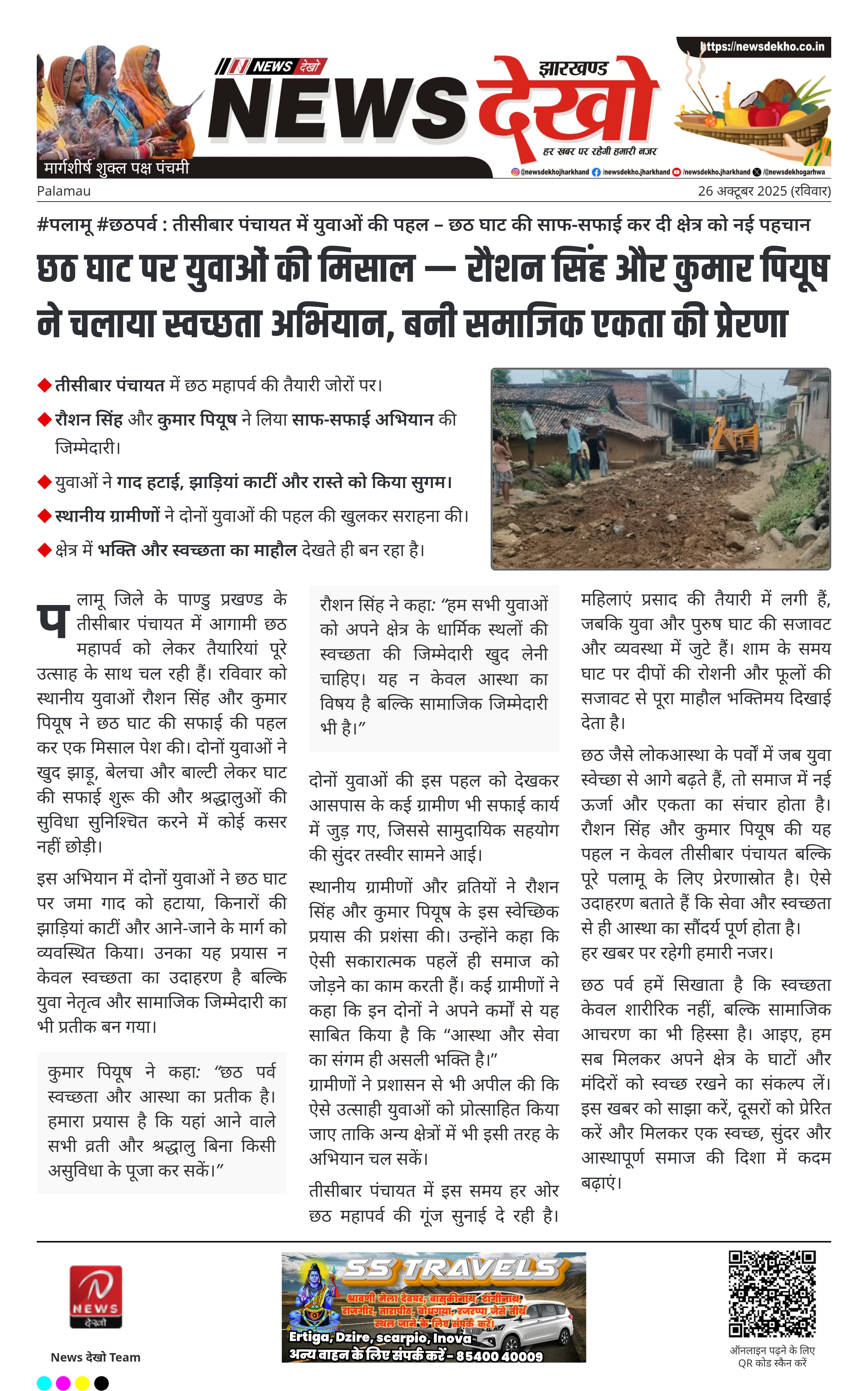 #पलामू #छठपर्व : तीसीबार पंचायत में युवाओं की पहल – छठ घाट की साफ-सफाई कर दी क्षेत्र को नई पहचान तीसीबार पंचायत में छठ महापर्व की तैयारी जोरों पर। रौशन सिंह और कुमार पियूष ने लिया साफ-सफाई अभियान की जिम्मेदारी। युवाओं ने गाद हटाई, झाड़ियां काटीं और रास्ते को किया सुगम। स्थानीय ग्रामीणों ने दोनों युवाओं की पहल की खुलकर सराहना की। क्षेत्र में भक्ति और स्वच्छता का माहौल देखते ही बन रहा है। पलामू जिले के पाण्डु प्रखण्ड के…