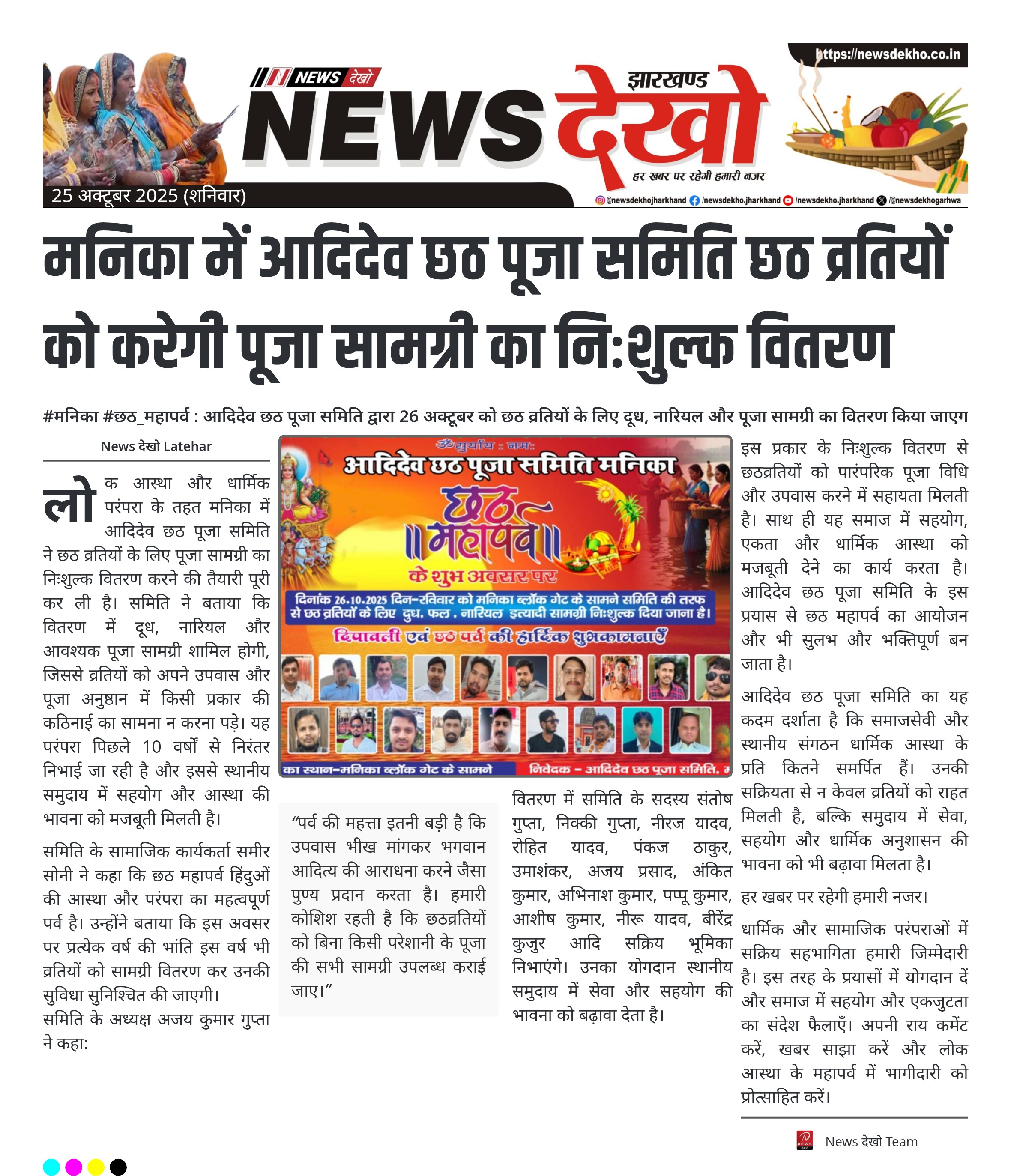 मनिका में आदिदेव छठ पूजा समिति छठ व्रतियों को करेगी पूजा सामग्री का निःशुल्क वितरण