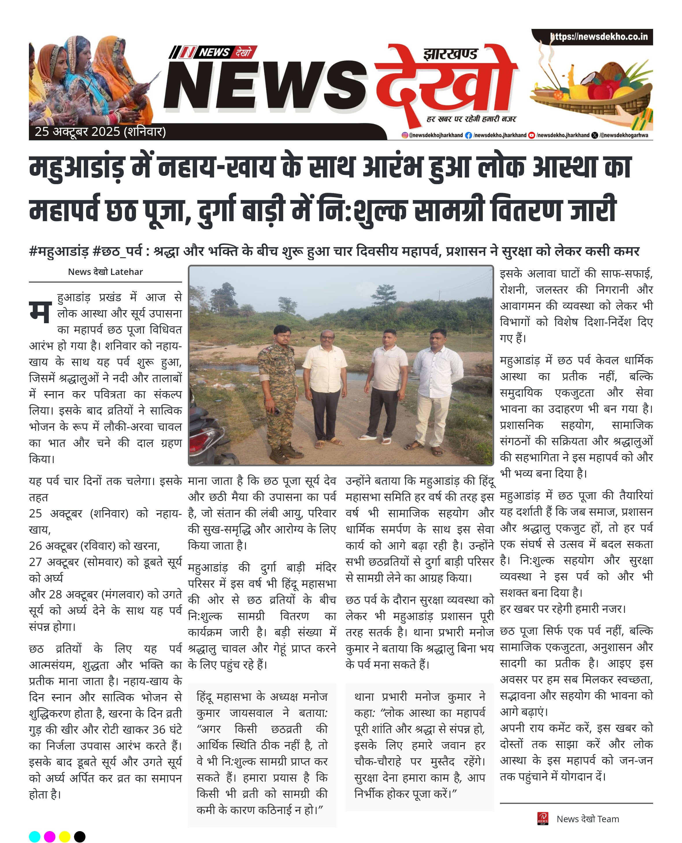 #महुआडांड़ #छठ_पर्व : श्रद्धा और भक्ति के बीच शुरू हुआ चार दिवसीय महापर्व, प्रशासन ने सुरक्षा को लेकर कसी कमर महुआडांड़ प्रखंड में आज से नहाय-खाय के साथ शुरू हुआ छठ पर्व। छठ व्रती करेंगे लौकी-भात और चने की दाल का सात्विक भोजन। अगले चार दिनों तक चलेगा लोक आस्था का यह महापर्व। हिंदू महासभा द्वारा व्रतियों को नि:शुल्क सामग्री का वितरण जारी। थाना प्रभारी मनोज कुमार ने दी सुरक्षा का भरोसा — हर चौक-चौराहे पर जवान तैनात। महुआडांड़ प्रखंड…