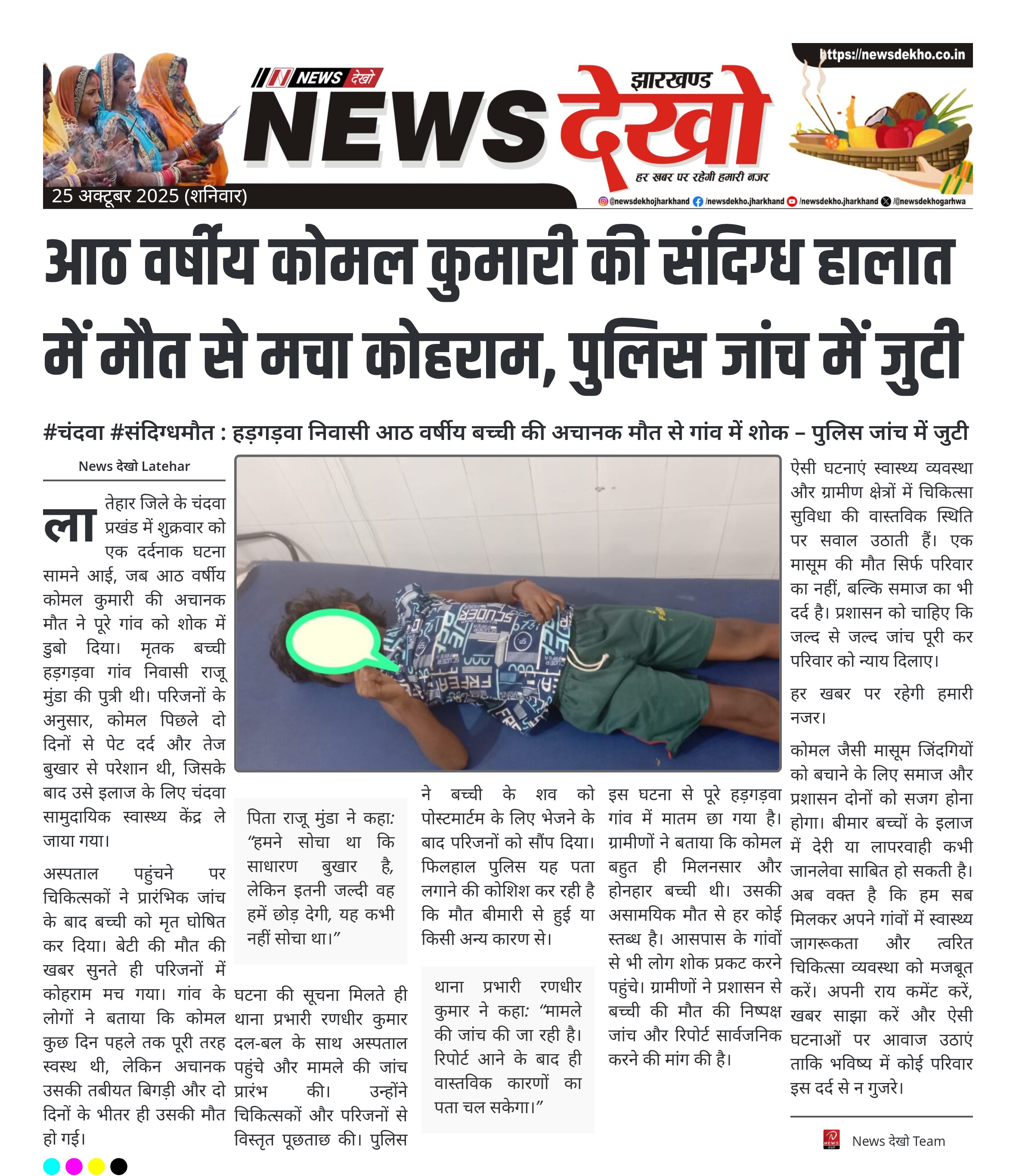 #चंदवा #संदिग्धमौत : हड़गड़वा निवासी आठ वर्षीय बच्ची की अचानक मौत से गांव में शोक – पुलिस जांच में जुटी हड़गड़वा गांव में आठ वर्षीय कोमल कुमारी की संदिग्ध परिस्थितियों में मौत। दो दिनों से पेट दर्द और तेज बुखार से थी पीड़ित। चंदवा अस्पताल में चिकित्सकों ने मृत घोषित किया। थाना प्रभारी रणधीर कुमार ने जांच शुरू की। ग्रामीणों ने निष्पक्ष जांच की मांग की। लातेहार जिले के चंदवा प्रखंड में शुक्रवार को एक दर्दनाक घटना सामने आई, जब…