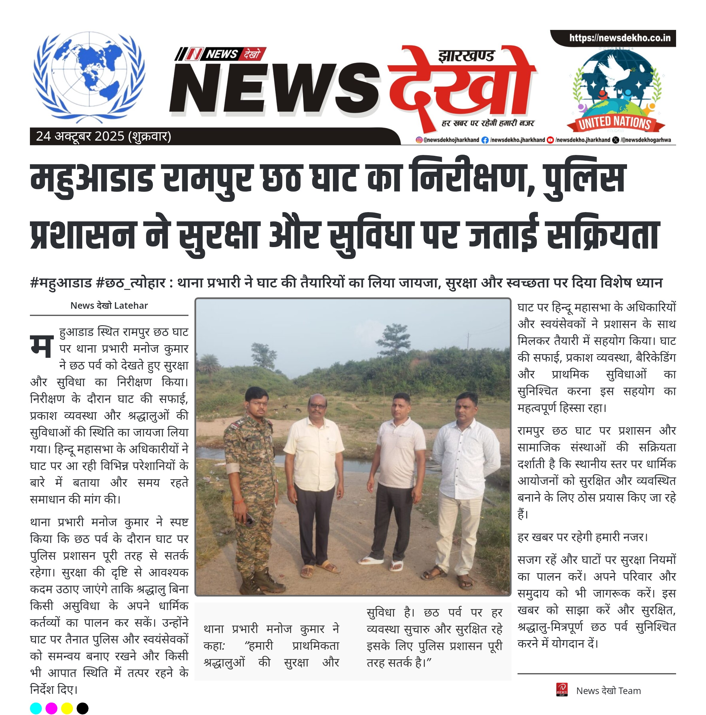 #महुआडाड #छठ_त्योहार : थाना प्रभारी ने घाट की तैयारियों का लिया जायजा, सुरक्षा और स्वच्छता पर दिया विशेष ध्यान महुआडाड थाना प्रभारी मनोज कुमार ने रामपुर छठ घाट का निरीक्षण किया। घाट पर सुरक्षा व्यवस्था, सफाई और श्रद्धालुओं की सुविधा का आकलन किया गया। हिंदू महासभा के अधिकारियों ने घाट की तैयारियों में आने वाली परेशानियों से थाना प्रभारी को अवगत कराया। थाना प्रभारी ने आश्वासन दिया कि छठ पर्व के दौरान पुलिस प्रशासन पूर्ण रूप से तत्पर रहेगा। सभी…