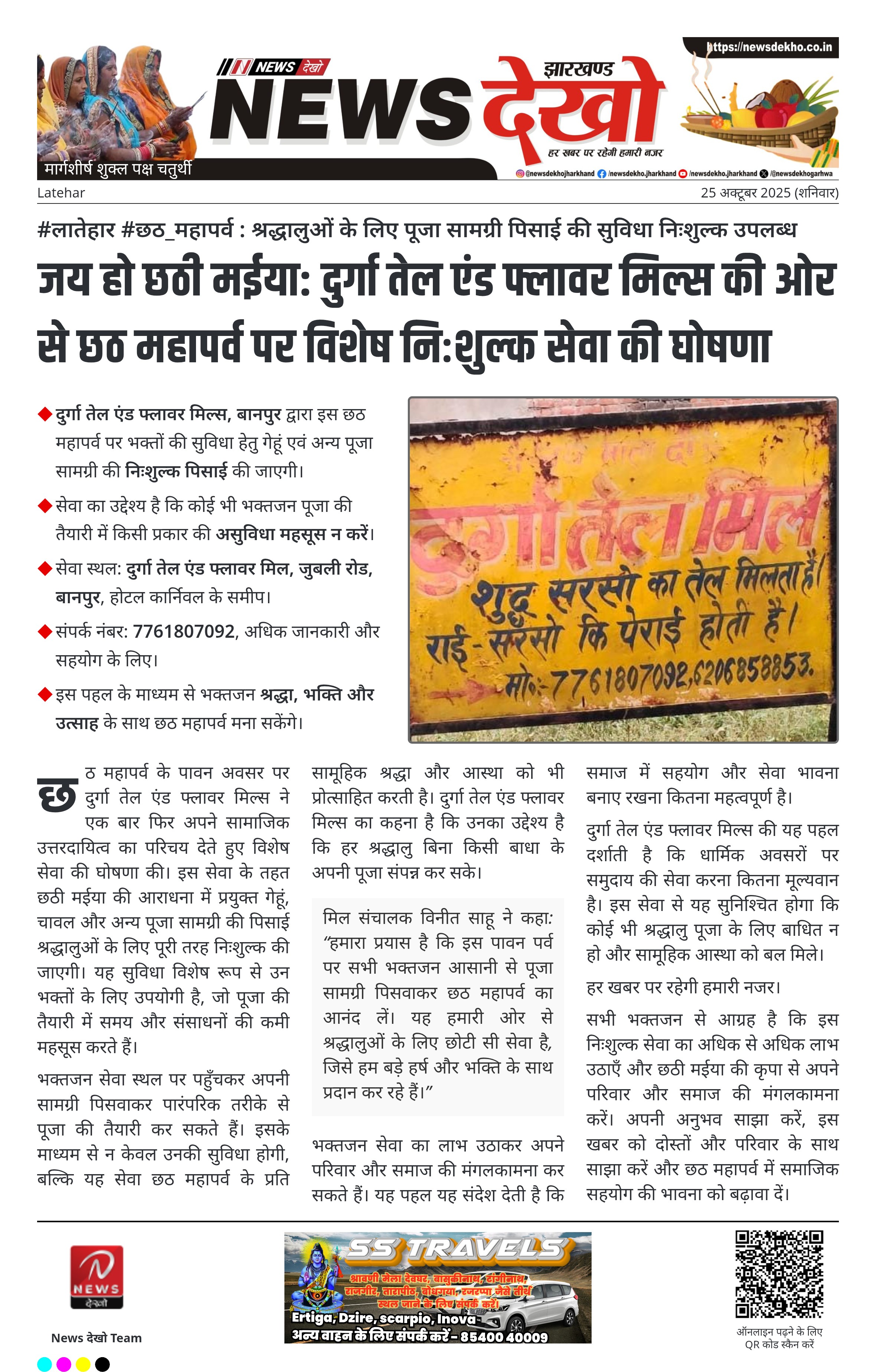 #लातेहार #छठ_महापर्व : श्रद्धालुओं के लिए पूजा सामग्री पिसाई की सुविधा निःशुल्क उपलब्ध दुर्गा तेल एंड फ्लावर मिल्स, बानपुर द्वारा इस छठ महापर्व पर भक्तों की सुविधा हेतु गेहूं एवं अन्य पूजा सामग्री की निःशुल्क पिसाई की जाएगी। सेवा का उद्देश्य है कि कोई भी भक्तजन पूजा की तैयारी में किसी प्रकार की असुविधा महसूस न करें। सेवा स्थल: दुर्गा तेल एंड फ्लावर मिल, जुबली रोड, बानपुर, होटल कार्निवल के समीप। संपर्क नंबर: 7761807092, अधिक जानकारी और सहयोग के लिए।…