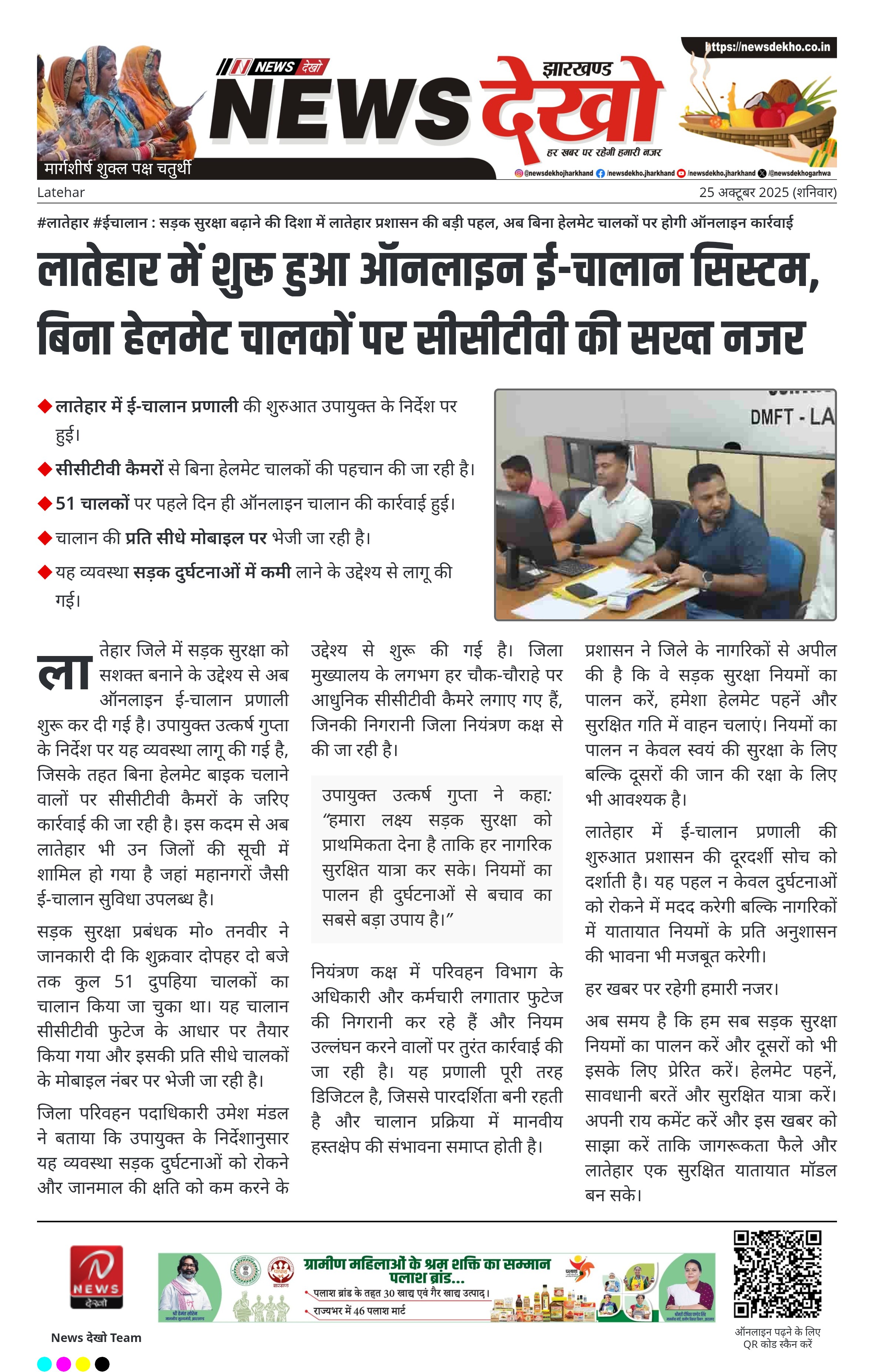 #लातेहार #ईचालान : सड़क सुरक्षा बढ़ाने की दिशा में लातेहार प्रशासन की बड़ी पहल, अब बिना हेलमेट चालकों पर होगी ऑनलाइन कार्रवाई लातेहार में ई-चालान प्रणाली की शुरुआत उपायुक्त के निर्देश पर हुई। सीसीटीवी कैमरों से बिना हेलमेट चालकों की पहचान की जा रही है। 51 चालकों पर पहले दिन ही ऑनलाइन चालान की कार्रवाई हुई। चालान की प्रति सीधे मोबाइल पर भेजी जा रही है। यह व्यवस्था सड़क दुर्घटनाओं में कमी लाने के उद्देश्य से लागू की गई। लातेहार…