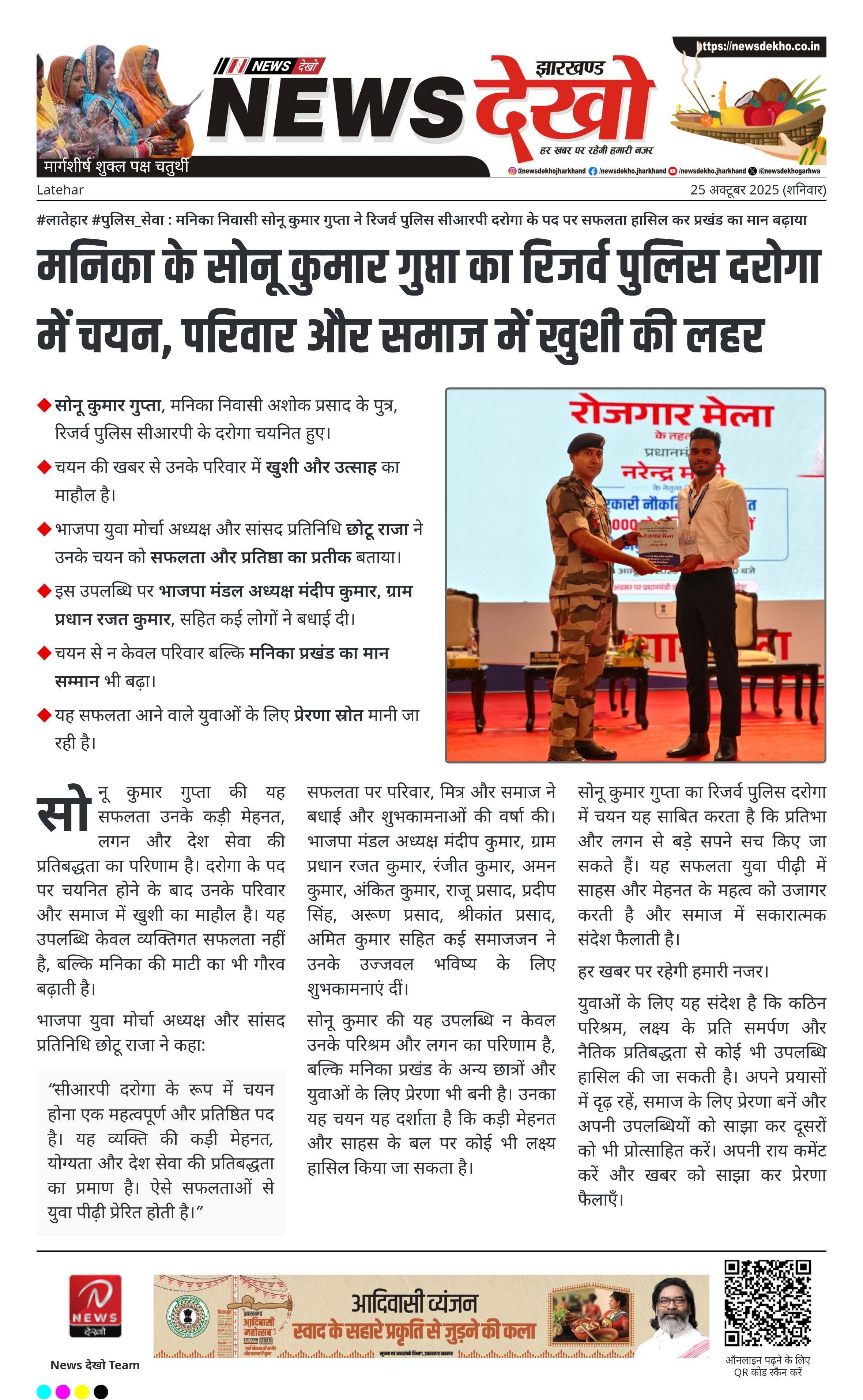 #लातेहार #पुलिस_सेवा : मनिका निवासी सोनू कुमार गुप्ता ने रिजर्व पुलिस सीआरपी दरोगा के पद पर सफलता हासिल कर प्रखंड का मान बढ़ाया सोनू कुमार गुप्ता, मनिका निवासी अशोक प्रसाद के पुत्र, रिजर्व पुलिस सीआरपी के दरोगा चयनित हुए। चयन की खबर से उनके परिवार में खुशी और उत्साह का माहौल है। भाजपा युवा मोर्चा अध्यक्ष और सांसद प्रतिनिधि छोटू राजा ने उनके चयन को सफलता और प्रतिष्ठा का प्रतीक बताया। इस उपलब्धि पर भाजपा मंडल अध्यक्ष मंदीप कुमार, ग्राम…