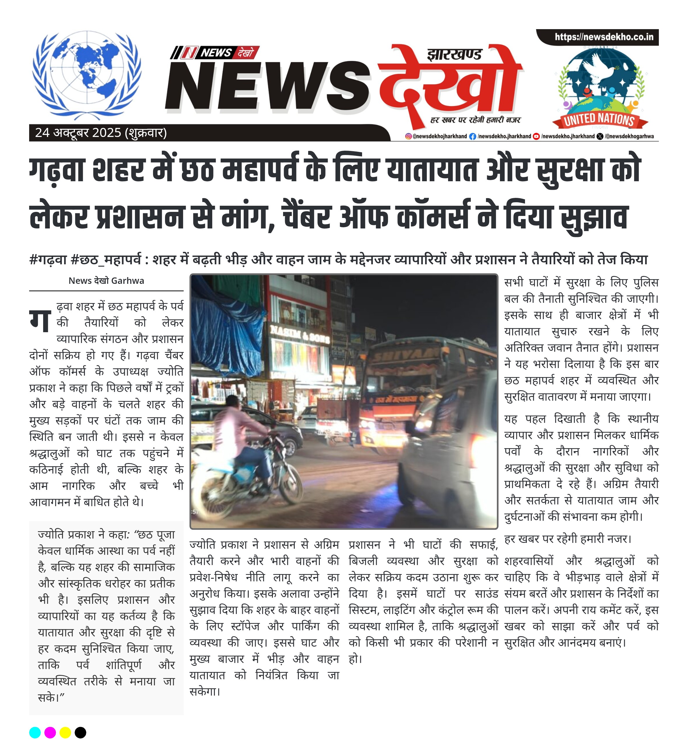 #गढ़वा #छठ_महापर्व : शहर में बढ़ती भीड़ और वाहन जाम के मद्देनजर व्यापारियों और प्रशासन ने तैयारियों को तेज किया गढ़वा शहर में छठ महापर्व के नजदीक आते ही श्रद्धालुओं और खरीदारों की भीड़ बढ़ गई है, जिससे मुख्य सड़कों पर यातायात जाम की समस्या उत्पन्न होने लगी है। गढ़वा चैंबर ऑफ कॉमर्स के उपाध्यक्ष ज्योति प्रकाश ने प्रशासन से अनुरोध किया कि पर्व के दौरान शहर में भारी वाहनों का प्रवेश पूरी तरह प्रतिबंधित किया जाए। उन्होंने सुझाव दिया…