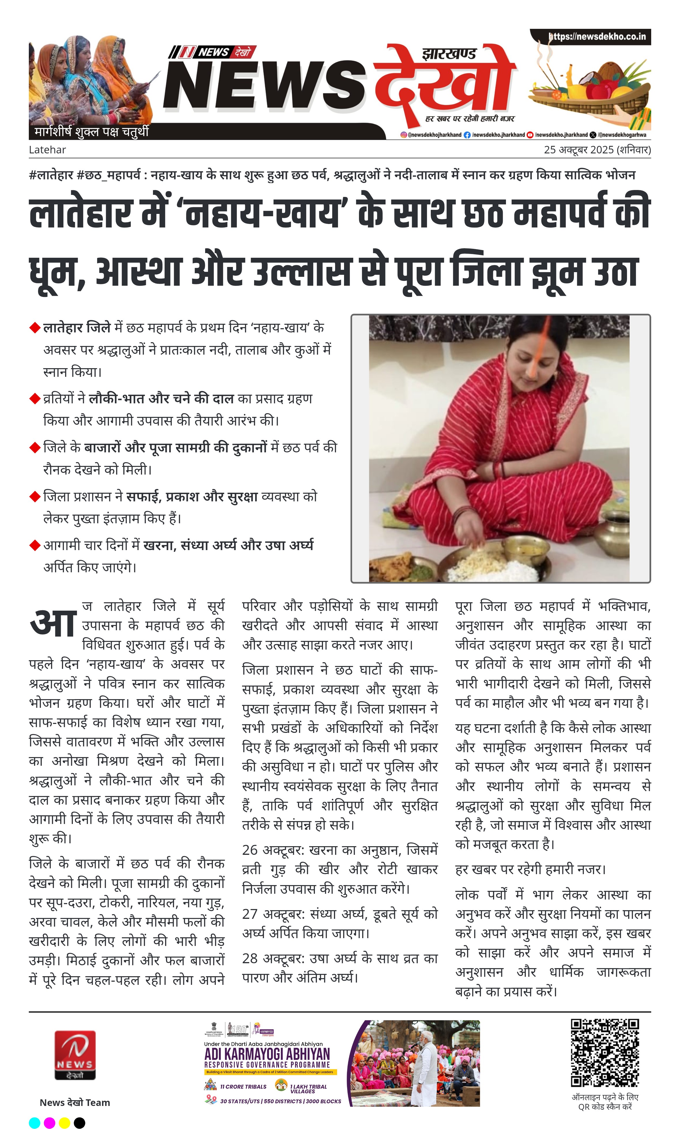 #लातेहार #छठ_महापर्व : नहाय-खाय के साथ शुरू हुआ छठ पर्व, श्रद्धालुओं ने नदी-तालाब में स्नान कर ग्रहण किया सात्विक भोजन लातेहार जिले में छठ महापर्व के प्रथम दिन ‘नहाय-खाय’ के अवसर पर श्रद्धालुओं ने प्रातःकाल नदी, तालाब और कुओं में स्नान किया। व्रतियों ने लौकी-भात और चने की दाल का प्रसाद ग्रहण किया और आगामी उपवास की तैयारी आरंभ की। जिले के बाजारों और पूजा सामग्री की दुकानों में छठ पर्व की रौनक देखने को मिली। जिला प्रशासन ने सफाई,…