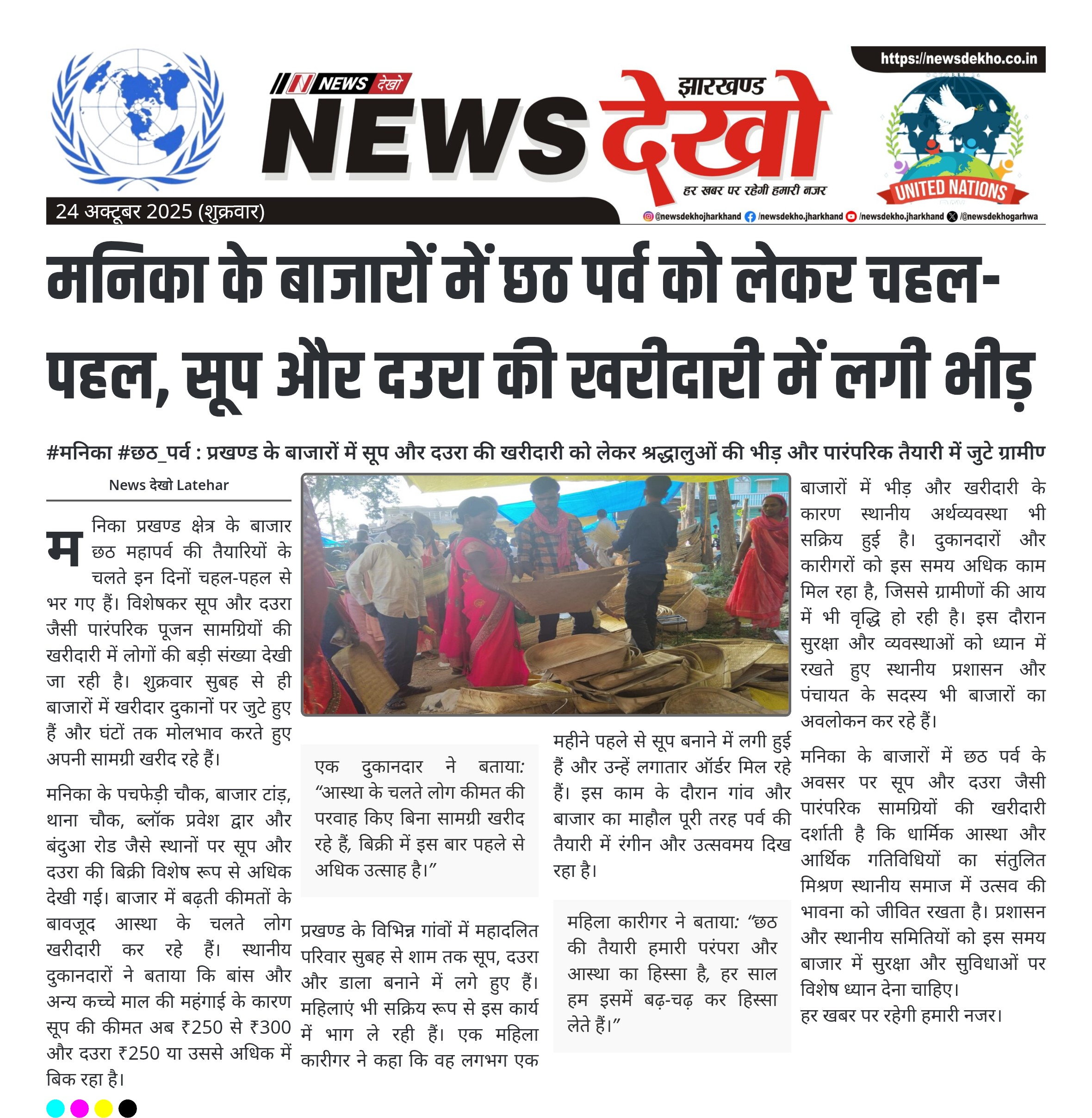 #मनिका #छठ_पर्व : प्रखण्ड के बाजारों में सूप और दउरा की खरीदारी को लेकर श्रद्धालुओं की भीड़ और पारंपरिक तैयारी में जुटे ग्रामीण मनिका प्रखण्ड के बाजारों में छठ पूजा की खरीदारी जोर पकड़ रही है। सूप और दउरा जैसी पूजन सामग्रियों की बिक्री में विशेष तेजी। बाजारों में पचफेड़ी चौक, बाजार टांड़, थाना चौक, ब्लॉक प्रवेश द्वार और बंदुआ रोड पर भारी भीड़। बांस और अन्य सामग्री की महंगाई के कारण कीमतें बढ़ी, सूप ₹250-300 और दउरा ₹250 या…