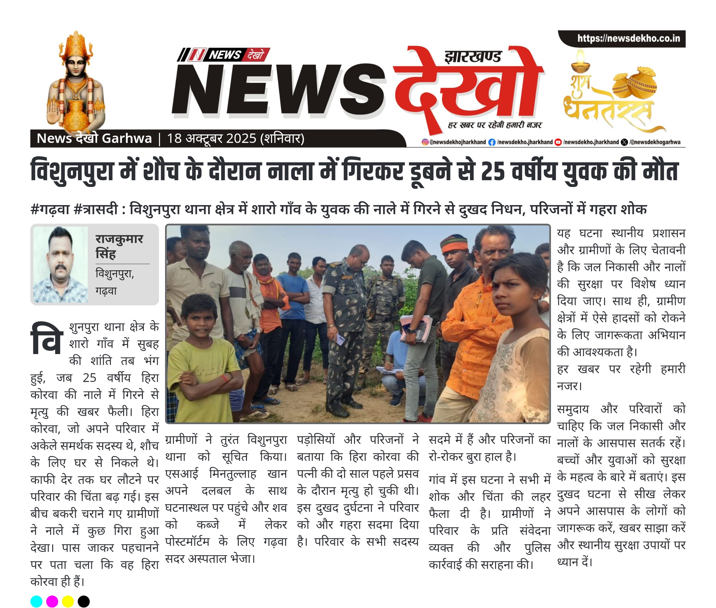 #गढ़वा #त्रासदी : विशुनपुरा थाना क्षेत्र में शारो गाँव के युवक की नाले में गिरने से दुखद निधन, परिजनों में गहरा शोक विशुनपुरा थाना क्षेत्र, शारो गाँव के मुड़ाअहरा निवासी 25 वर्षीय हिरा कोरवा की शौच के दौरान नाले में गिरने से मृत्यु हुई। हिरा कोरवा, पिता स्व. डोमन कोरवा के पुत्र थे और उनकी पत्नी की दो साल पहले प्रसव के दौरान मृत्यु हो चुकी थी। घटना की सूचना मिलने पर एसआई मिनतुल्लाह खान अपने दलबल के साथ घटनास्थल…