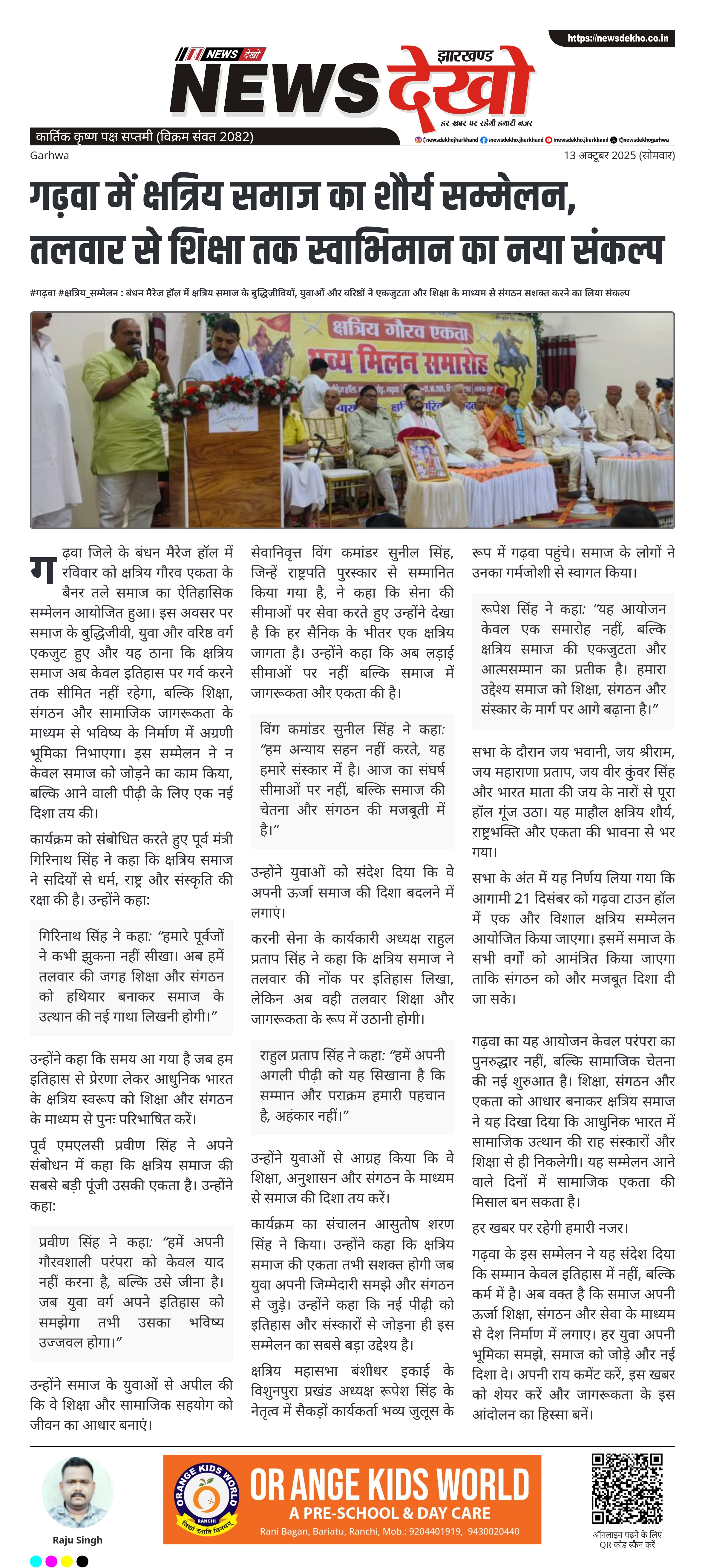 #गढ़वा #क्षत्रिय_सम्मेलन : बंधन मैरेज हॉल में क्षत्रिय समाज के बुद्धिजीवियों, युवाओं और वरिष्ठों ने एकजुटता और शिक्षा के माध्यम से संगठन सशक्त करने का लिया संकल्प गढ़वा के बंधन मैरेज हॉल में हुआ क्षत्रिय समाज का भव्य सम्मेलन। पूर्व मंत्री गिरिनाथ सिंह, पूर्व एमएलसी प्रवीण सिंह और विंग कमांडर सुनील सिंह रहे मुख्य वक्ता। राहुल प्रताप सिंह ने कहा — अब शिक्षा और संगठन ही होंगे समाज की तलवार। विशुनपुरा से सैकड़ों कार्यकर्ता पहुंचे, रूपेश सिंह के नेतृत्व में…