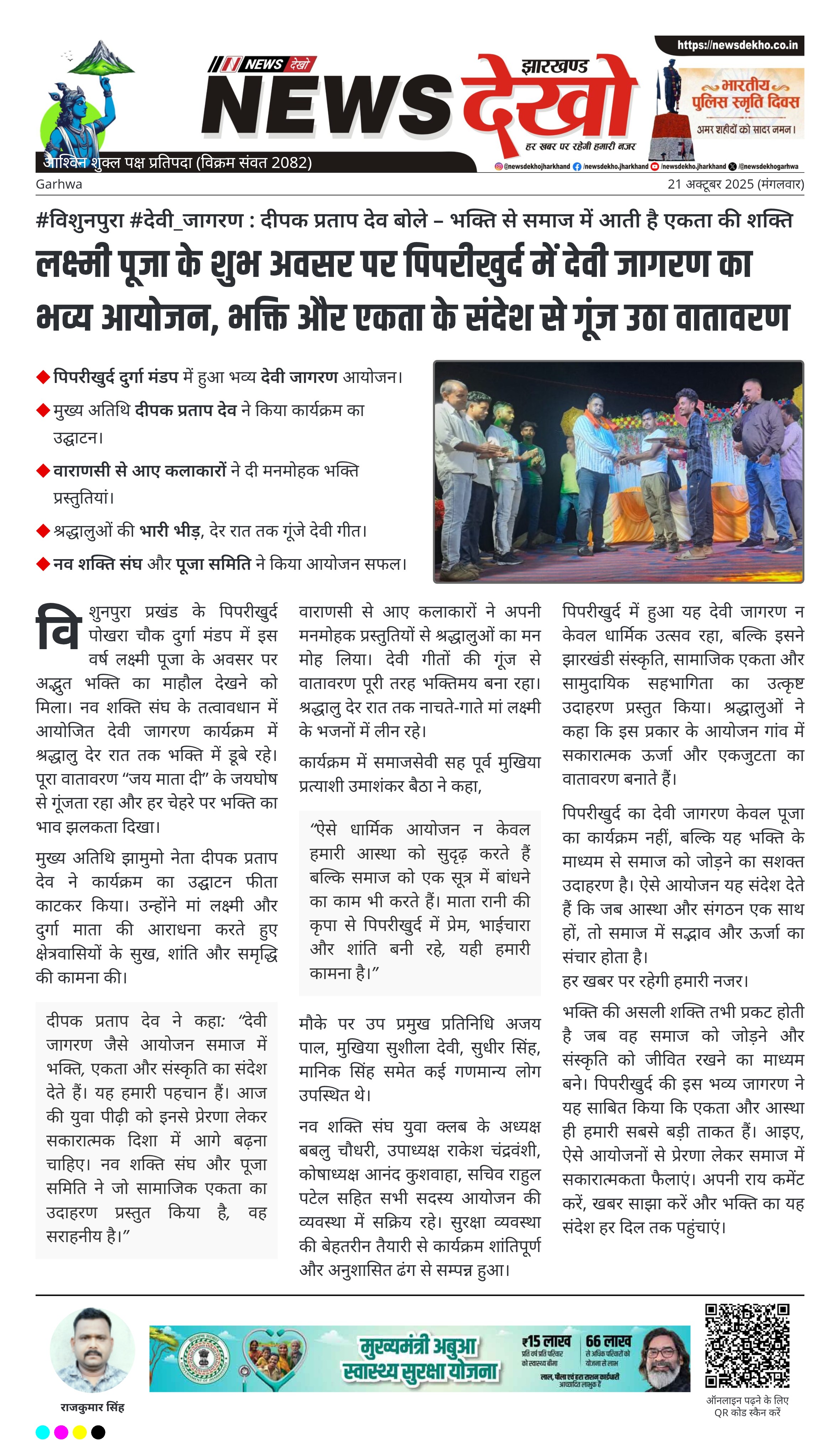 #विशुनपुरा #देवी_जागरण : दीपक प्रताप देव बोले – भक्ति से समाज में आती है एकता की शक्ति पिपरीखुर्द दुर्गा मंडप में हुआ भव्य देवी जागरण आयोजन। मुख्य अतिथि दीपक प्रताप देव ने किया कार्यक्रम का उद्घाटन। वाराणसी से आए कलाकारों ने दी मनमोहक भक्ति प्रस्तुतियां। श्रद्धालुओं की भारी भीड़, देर रात तक गूंजे देवी गीत। नव शक्ति संघ और पूजा समिति ने किया आयोजन सफल। विशुनपुरा प्रखंड के पिपरीखुर्द पोखरा चौक दुर्गा मंडप में इस वर्ष लक्ष्मी पूजा के अवसर…
