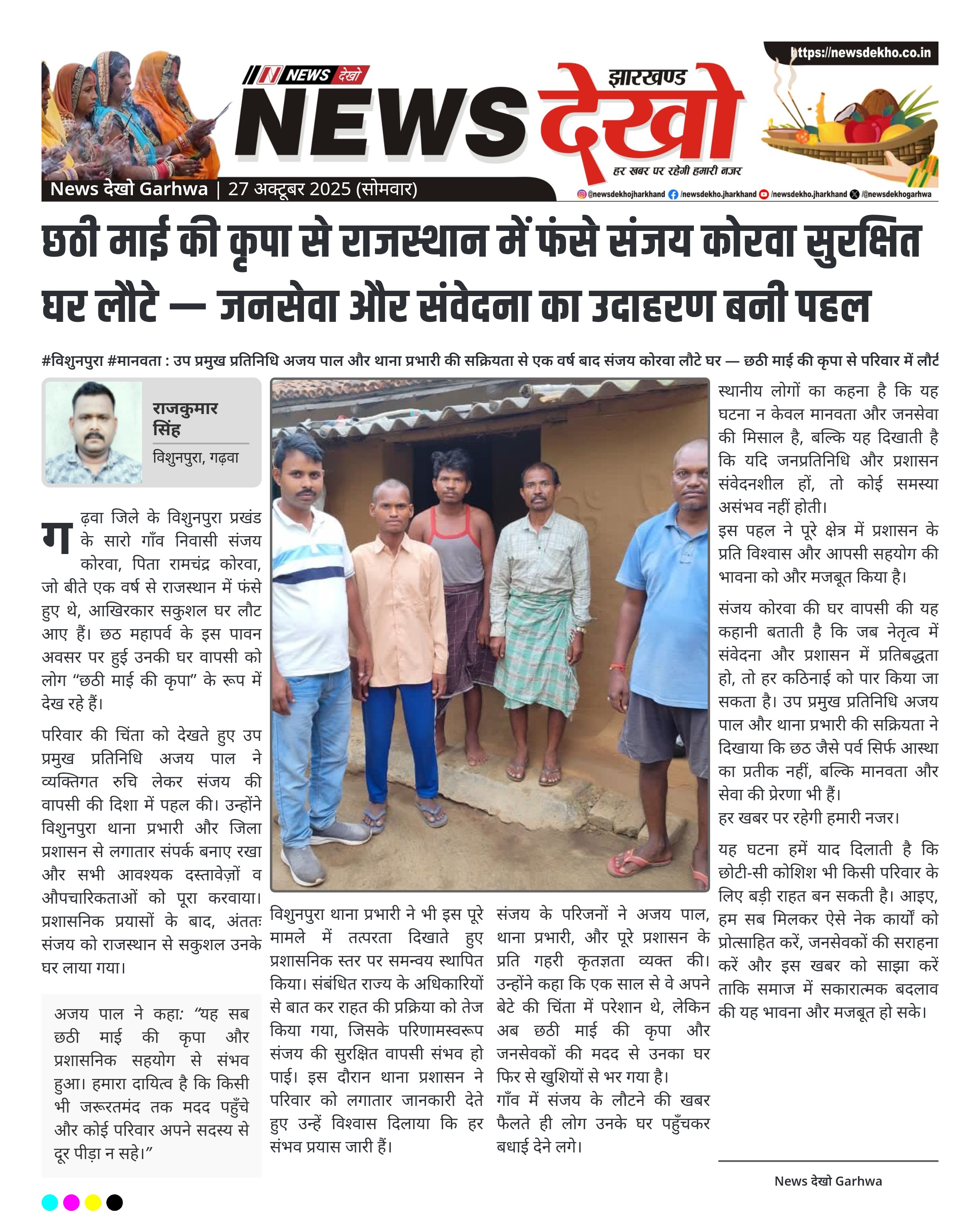 छठी माई की कृपा से राजस्थान में फंसे संजय कोरवा सुरक्षित घर लौटे — जनसेवा और संवेदना का उदाहरण बनी पहल