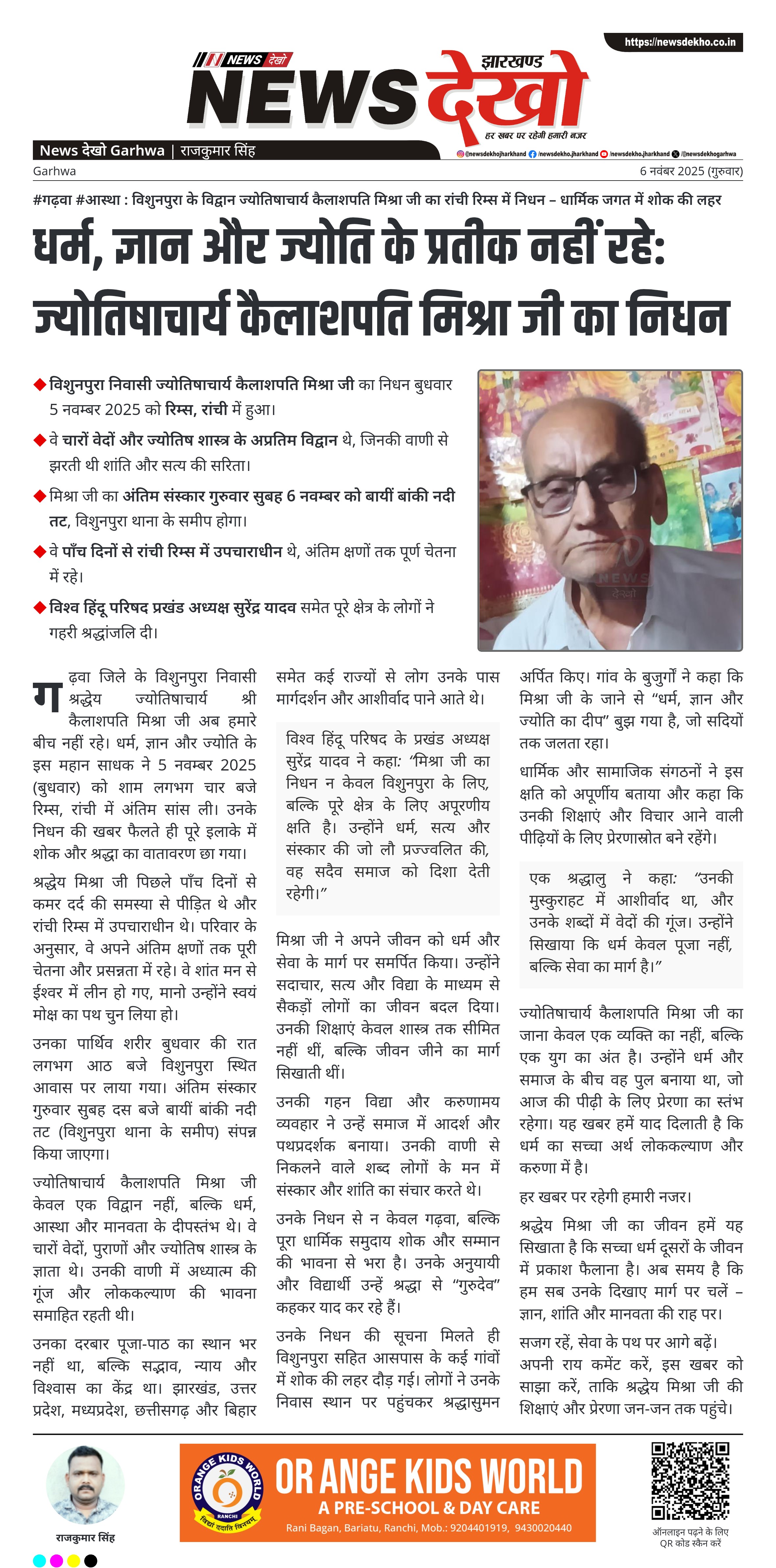 #गढ़वा #आस्था : विशुनपुरा के विद्वान ज्योतिषाचार्य कैलाशपति मिश्रा जी का रांची रिम्स में निधन – धार्मिक जगत में शोक की लहर विशुनपुरा निवासी ज्योतिषाचार्य कैलाशपति मिश्रा जी का निधन बुधवार 5 नवम्बर 2025 को रिम्स, रांची में हुआ। वे चारों वेदों और ज्योतिष शास्त्र के अप्रतिम विद्वान थे, जिनकी वाणी से झरती थी शांति और सत्य की सरिता। मिश्रा जी का अंतिम संस्कार गुरुवार सुबह 6 नवम्बर को बायीं बांकी नदी तट, विशुनपुरा थाना के समीप होगा। वे पाँच…