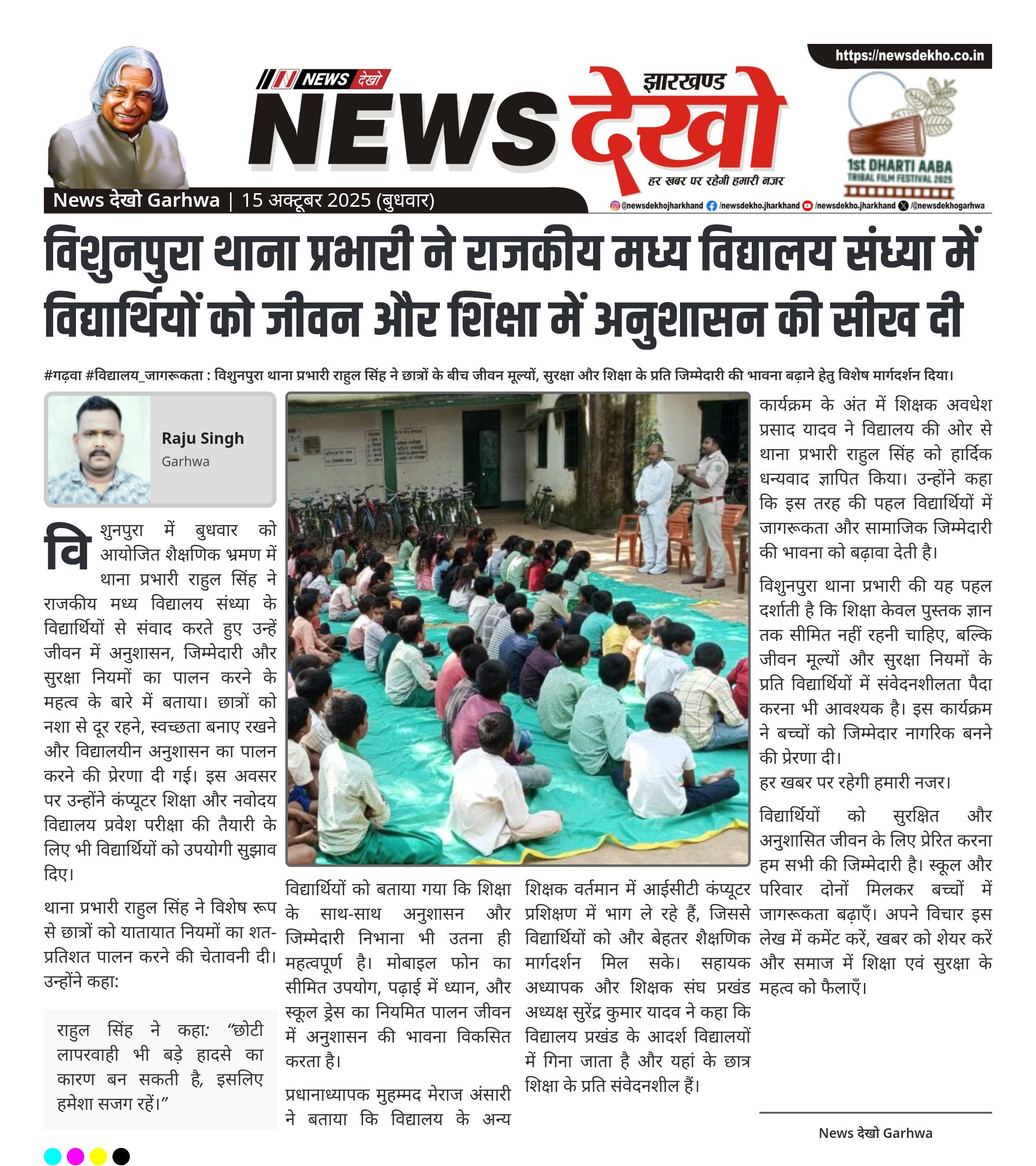 #गढ़वा #विद्यालय_जागरूकता : विशुनपुरा थाना प्रभारी राहुल सिंह ने छात्रों के बीच जीवन मूल्यों, सुरक्षा और शिक्षा के प्रति जिम्मेदारी की भावना बढ़ाने हेतु विशेष मार्गदर्शन दिया। विशुनपुरा थाना प्रभारी राहुल सिंह ने राजकीय मध्य विद्यालय संध्या का शैक्षणिक भ्रमण किया। छात्रों को यातायात नियमों, नशा विरोध, स्वच्छता, स्वास्थ्य और मोबाइल फोन उपयोग के प्रति जागरूक किया गया। कंप्यूटर शिक्षा और जवाहर नवोदय विद्यालय प्रवेश परीक्षा की तैयारी के लिए मार्गदर्शन दिया गया। प्रधानाध्यापक मुहम्मद मेराज अंसारी ने शिक्षकों के…
