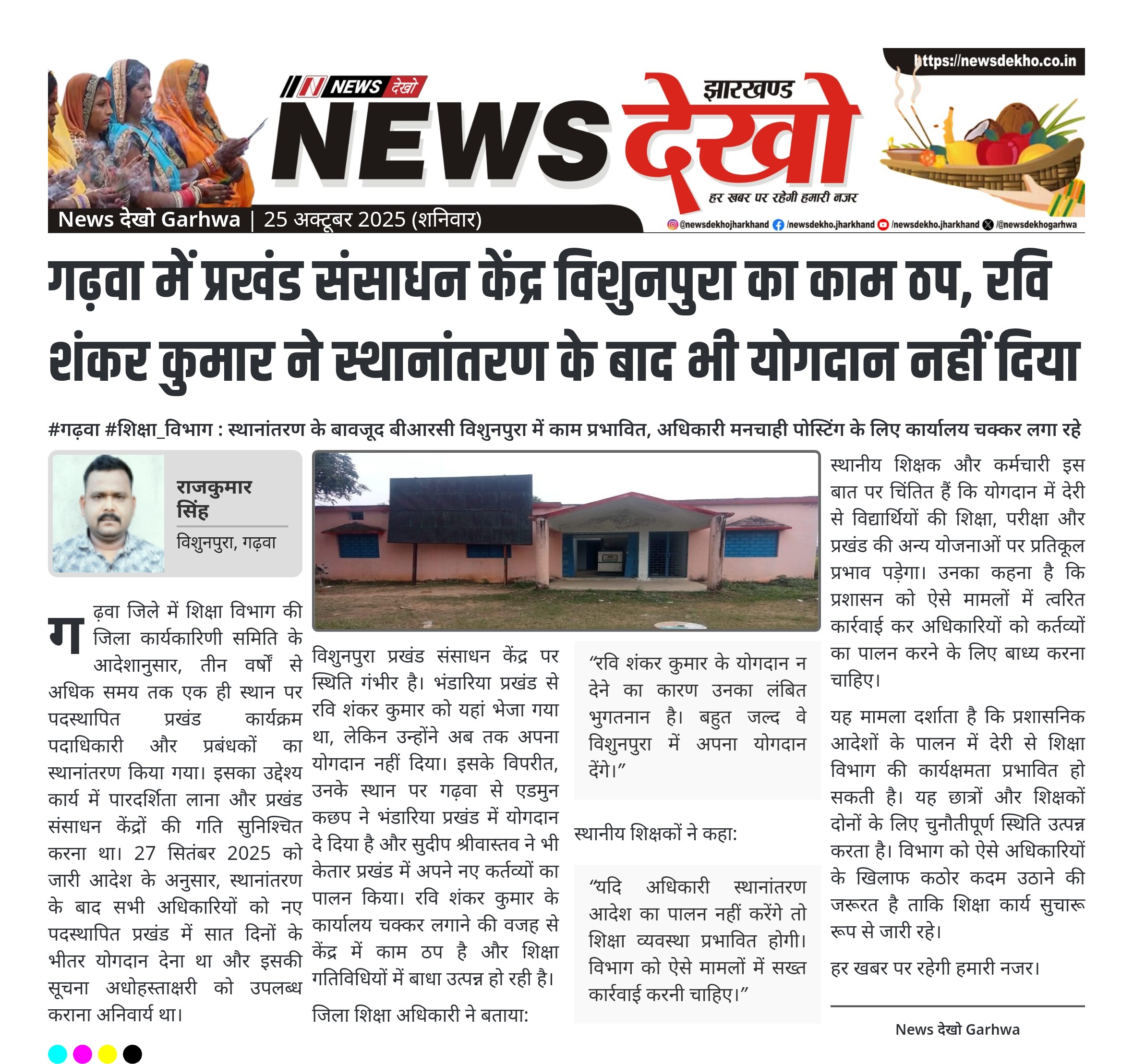 #गढ़वा #शिक्षा_विभाग : स्थानांतरण के बावजूद बीआरसी विशुनपुरा में काम प्रभावित, अधिकारी मनचाही पोस्टिंग के लिए कार्यालय चक्कर लगा रहे हैं रवि शंकर कुमार, जो भंडारिया प्रखंड से स्थानांतरित होकर विशुनपुरा प्रखंड संसाधन केंद्र में आए थे, ने अब तक अपना योगदान नहीं दिया। जिला कार्यकारिणी समिति के आदेश के अनुसार, नए स्थानांतरण के सात दिनों के भीतर योगदान देना अनिवार्य था, लेकिन आदेश जारी हुए लगभग एक माह बीत चुका है। सुदीप श्रीवास्तव, जो पहले विशुनपुरा में कार्यरत थे,…