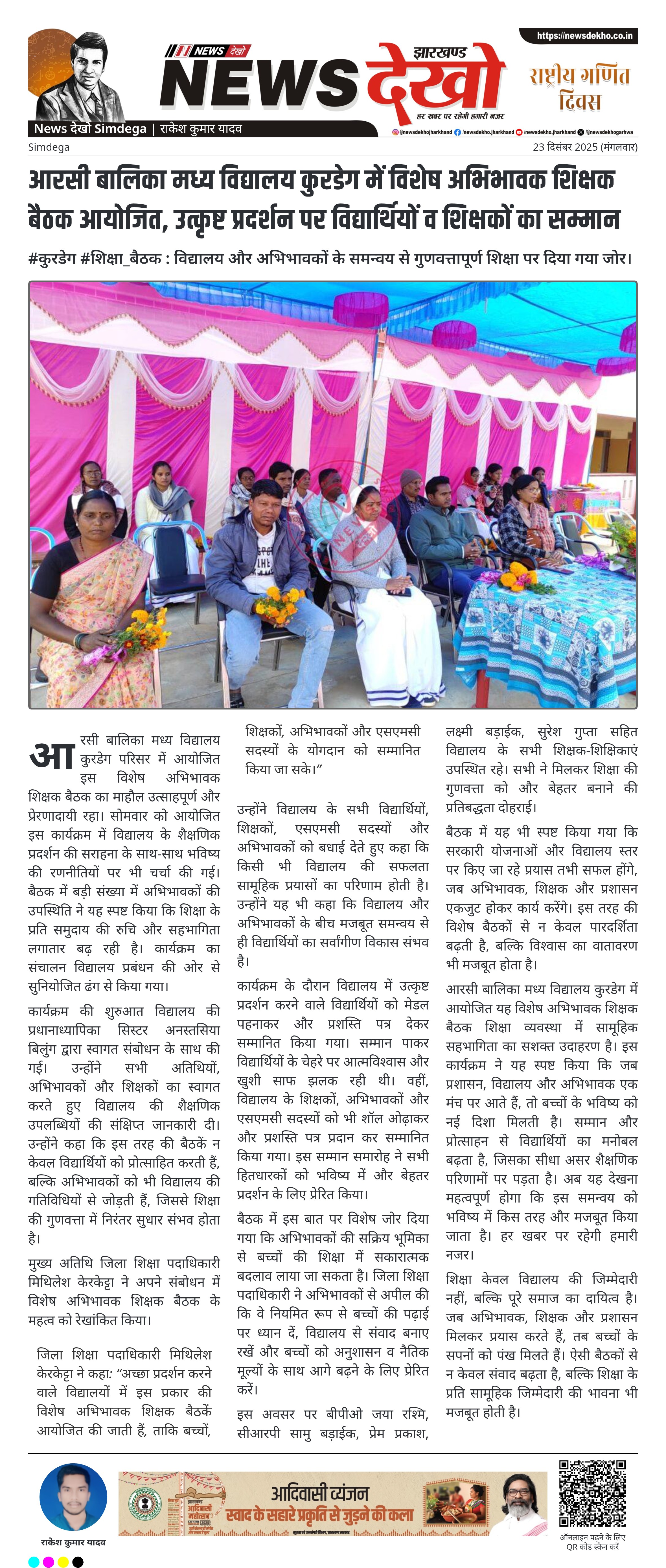 #कुरडेग #शिक्षा_बैठक : विद्यालय और अभिभावकों के समन्वय से गुणवत्तापूर्ण शिक्षा पर दिया गया जोर। आरसी बालिका मध्य विद्यालय, कुरडेग में विशेष अभिभावक शिक्षक बैठक आयोजित। मुख्य अतिथि के रूप में जिला शिक्षा पदाधिकारी मिथिलेश केरकेट्टा रहे उपस्थित। उत्कृष्ट प्रदर्शन करने वाले विद्यार्थियों को मेडल व प्रशस्ति पत्र देकर सम्मान। शिक्षकों, अभिभावकों व एसएमसी सदस्यों को शॉल ओढ़ाकर किया गया सम्मानित। शिक्षा में विद्यालय-अभिभावक समन्वय को और सशक्त बनाने पर दिया गया बल। आरसी बालिका मध्य विद्यालय कुरडेग परिसर में…
