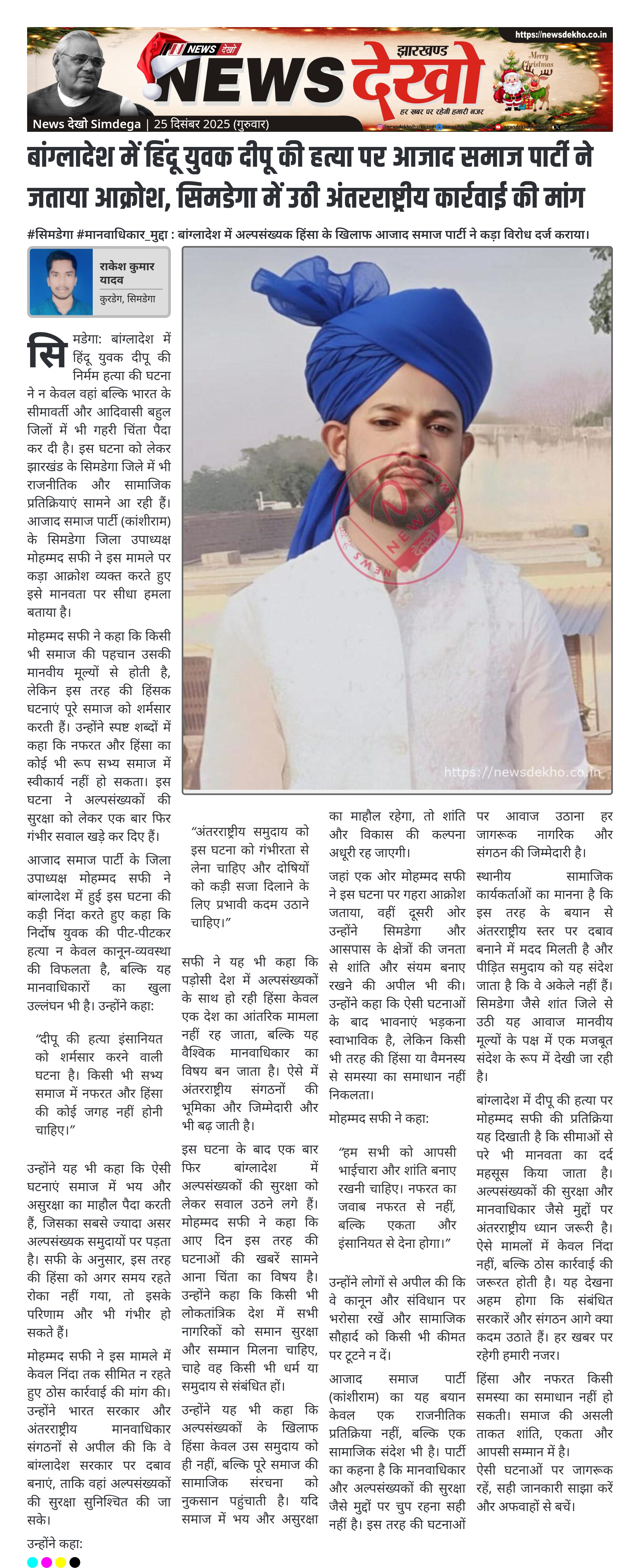 बांग्लादेश में हिंदू युवक दीपू की हत्या पर आजाद समाज पार्टी ने जताया आक्रोश, सिमडेगा में उठी अंतरराष्ट्रीय कार्रवाई की मांग