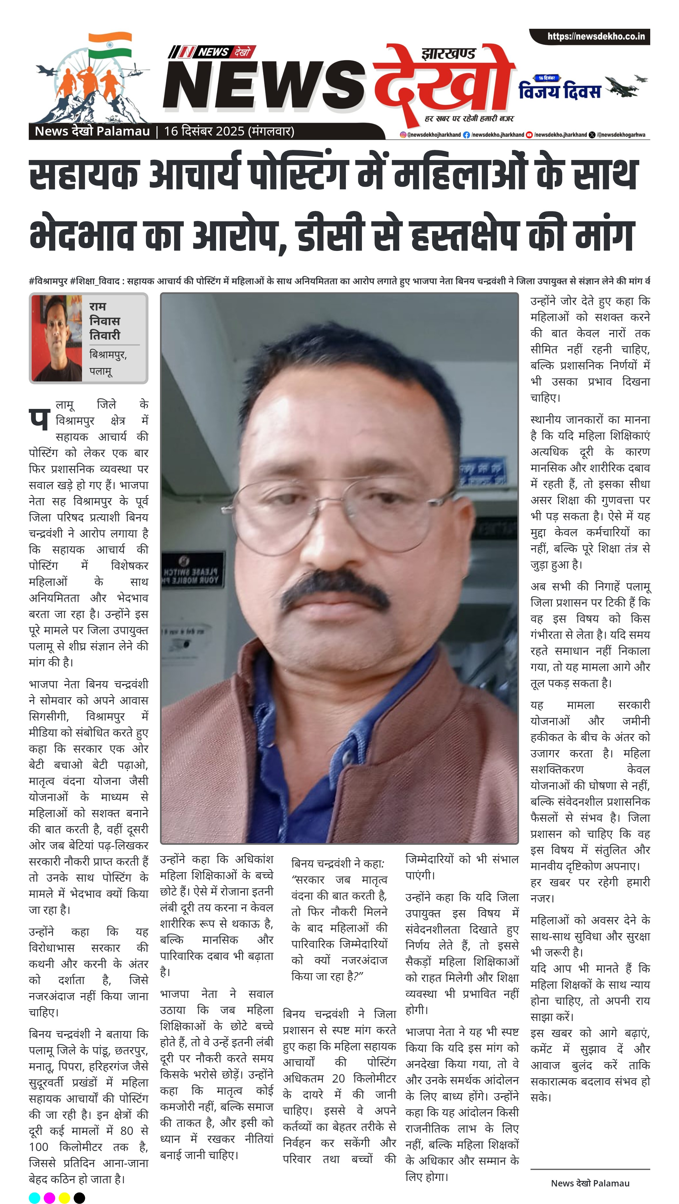 #विश्रामपुर #शिक्षा_विवाद : सहायक आचार्य की पोस्टिंग में महिलाओं के साथ अनियमितता का आरोप लगाते हुए भाजपा नेता बिनय चन्द्रवंशी ने जिला उपायुक्त से संज्ञान लेने की मांग की सहायक आचार्य पोस्टिंग में महिलाओं के साथ अनियमितता और भेदभाव का आरोप। बयान देने वाले भाजपा नेता व पूर्व जिला परिषद प्रत्याशी बिनय चन्द्रवंशी। सुदूरवर्ती प्रखंडों में महिला शिक्षिकाओं की पोस्टिंग को बताया गया कष्टप्रद। छोटे बच्चों वाली माताओं के लिए 100 किलोमीटर दूर सेवा कठिन। 20 किलोमीटर के दायरे में…