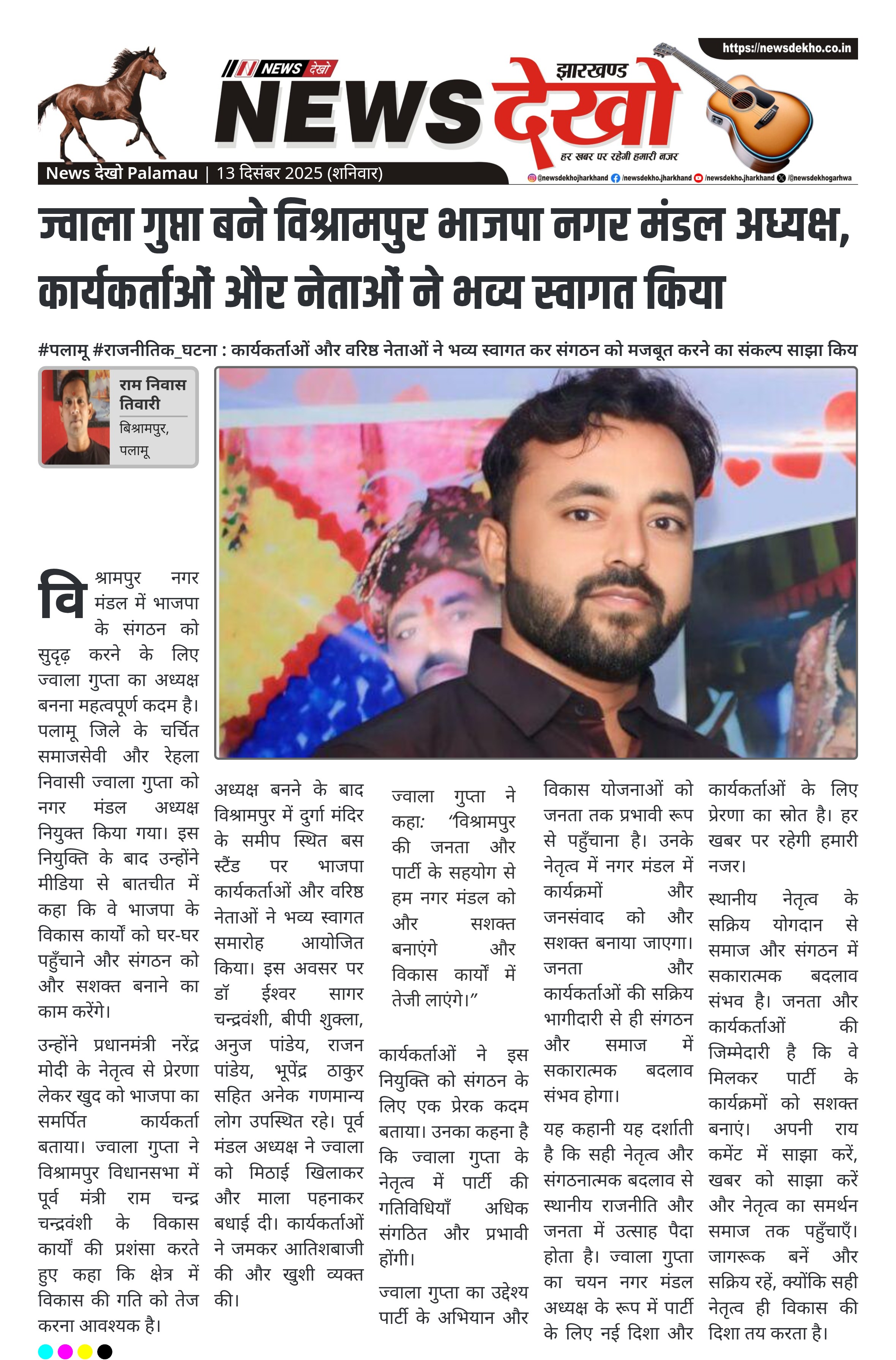 #पलामू #राजनीतिक_घटना : कार्यकर्ताओं और वरिष्ठ नेताओं ने भव्य स्वागत कर संगठन को मजबूत करने का संकल्प साझा किया ज्वाला गुप्ता को विश्रामपुर भाजपा नगर मंडल अध्यक्ष नियुक्त किया गया। प्रधानमंत्री नरेंद्र मोदी से प्रेरित होकर पार्टी को सशक्त बनाने का संकल्प। विश्रामपुर विधानसभा में पूर्व मंत्री राम चन्द्र चन्द्रवंशी के विकास कार्यों की सराहना। वरिष्ठ नेताओं डाॅ ईश्वर सागर चन्द्रवंशी, बीपी शुक्ला, अनुज पांडेय, राजन पांडेय, भूपेंद्र ठाकुर ने बधाई दी। कार्यकर्ताओं और जनता ने नव-निर्वाचित अध्यक्ष का स्वागत…
