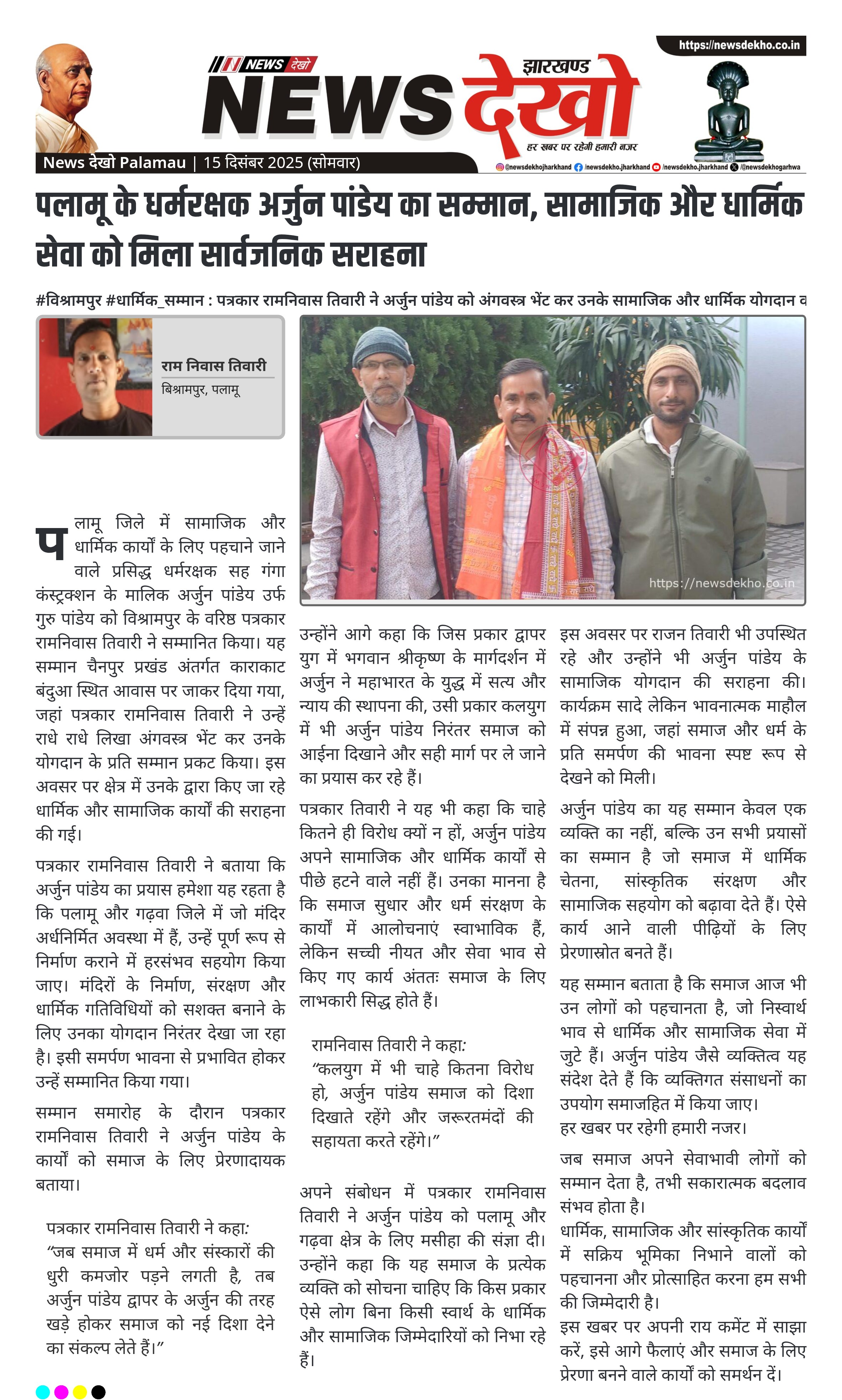 पलामू के धर्मरक्षक अर्जुन पांडेय का सम्मान, सामाजिक और धार्मिक सेवा को मिला सार्वजनिक सराहना