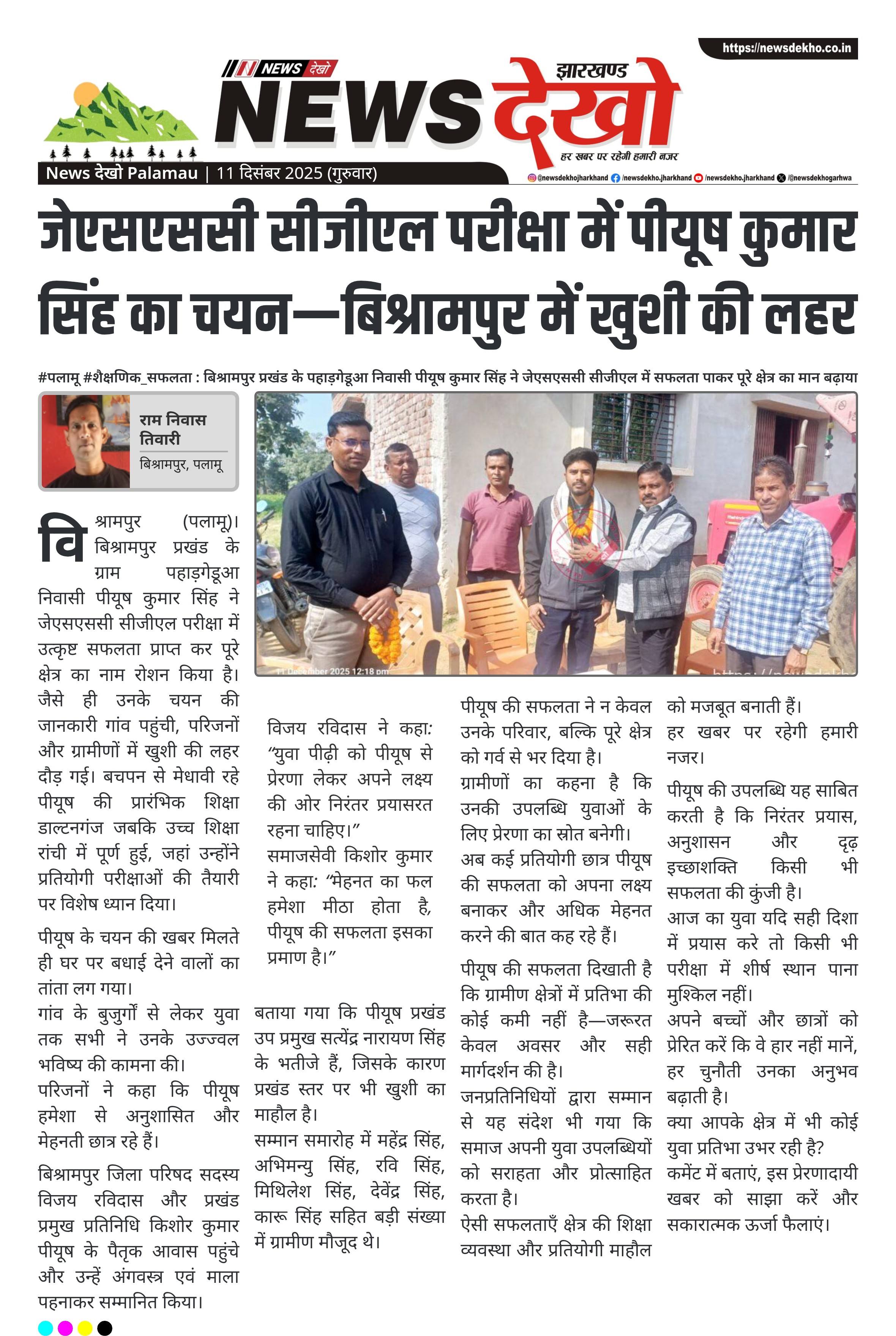 जेएसएससी सीजीएल परीक्षा में पीयूष कुमार सिंह का चयन—बिश्रामपुर में खुशी की लहर