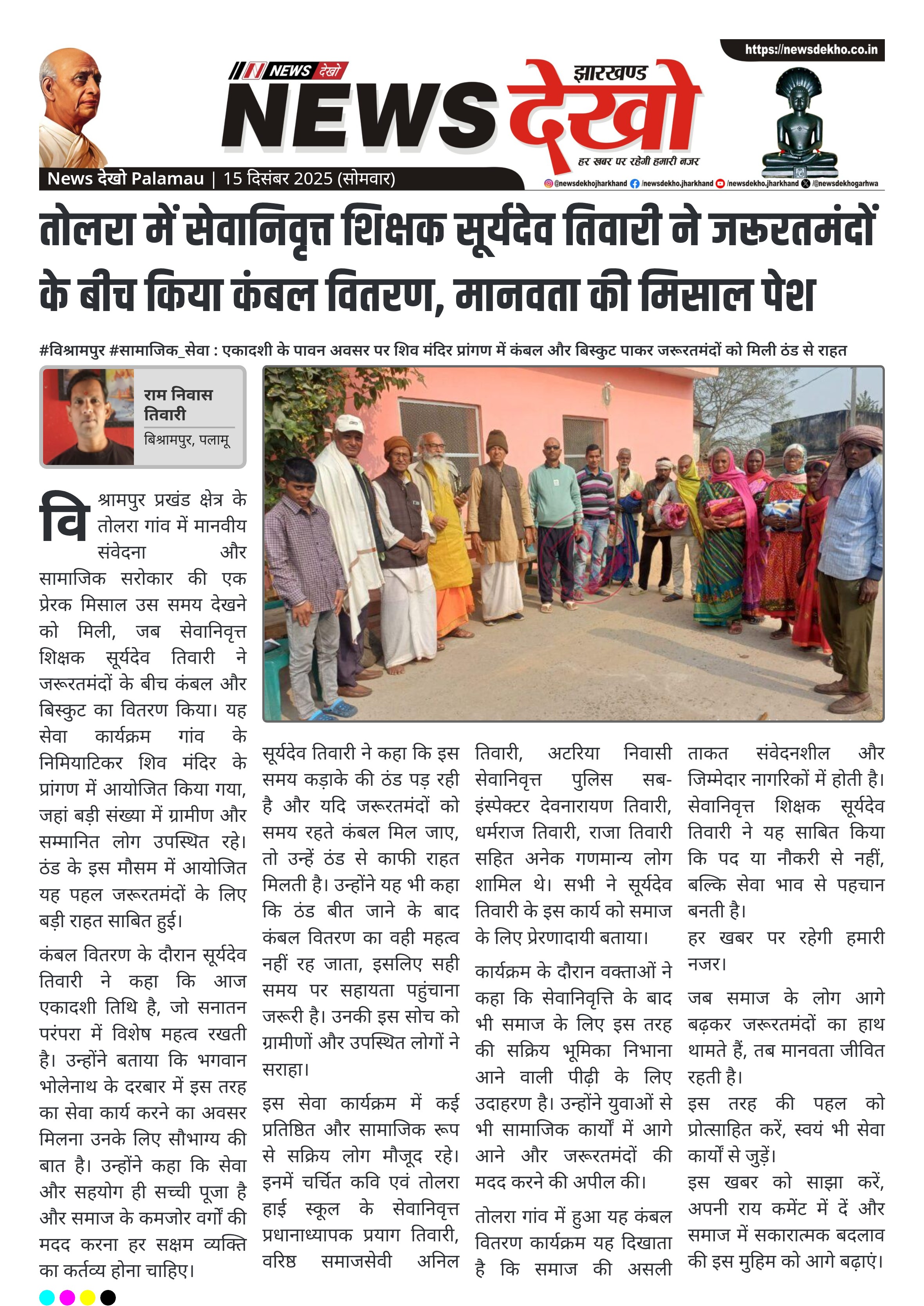 तोलरा में सेवानिवृत्त शिक्षक सूर्यदेव तिवारी ने जरूरतमंदों के बीच किया कंबल वितरण, मानवता की मिसाल पेश