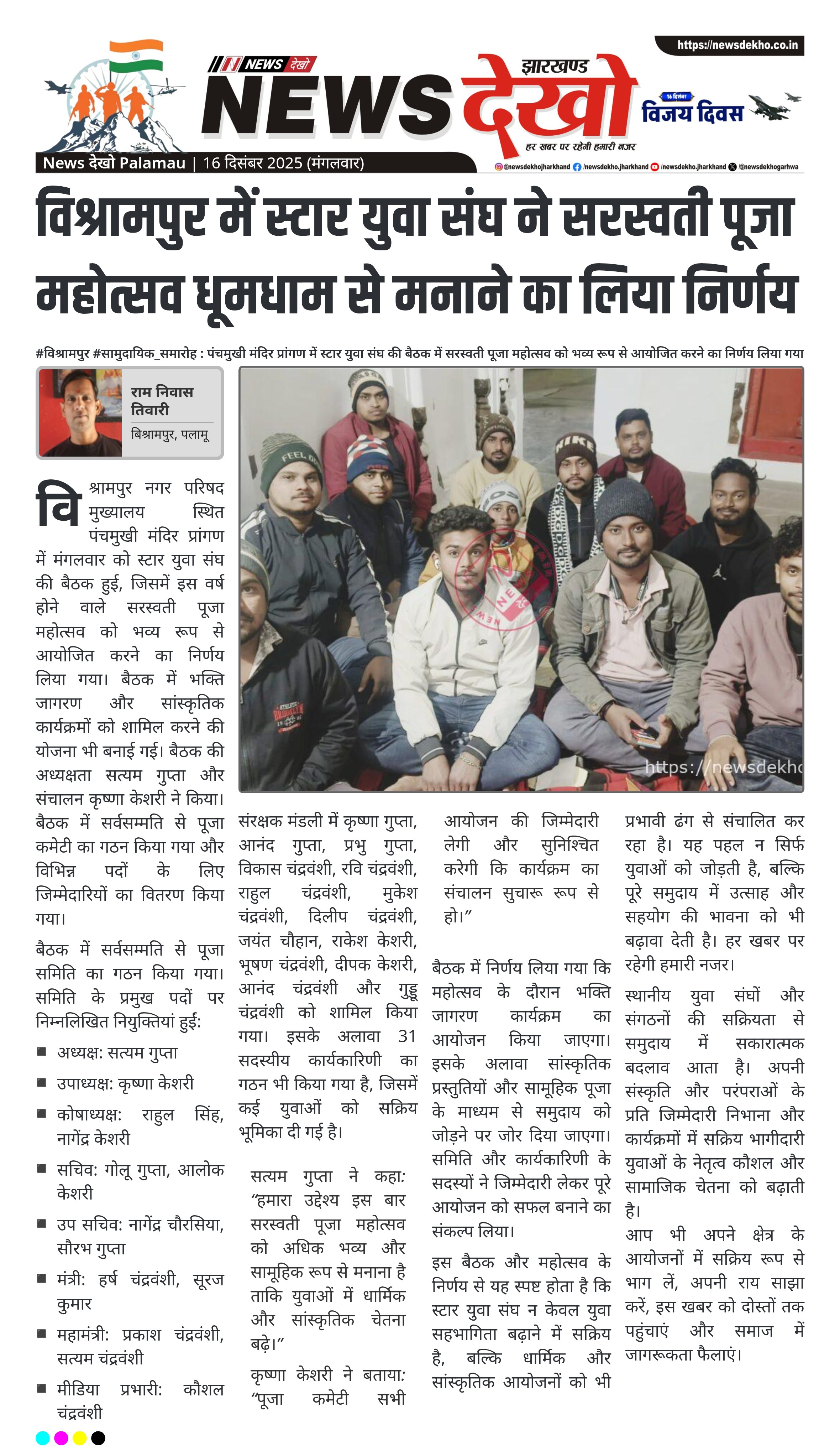 #विश्रामपुर #सामुदायिक_समारोह : पंचमुखी मंदिर प्रांगण में स्टार युवा संघ की बैठक में सरस्वती पूजा महोत्सव को भव्य रूप से आयोजित करने का निर्णय लिया गया विश्रामपुर नगर परिषद मुख्यालय स्थित पंचमुखी मंदिर प्रांगण में स्टार युवा संघ की बैठक हुई। बैठक में सरस्वती पूजा महोत्सव को धूमधाम से मनाने और भक्ति जागरण कार्यक्रम आयोजित करने पर चर्चा हुई। बैठक की अध्यक्षता सत्यम गुप्ता और संचालन कृष्णा केशरी ने किया। पूजा कमेटी का गठन कर सत्यम गुप्ता को अध्यक्ष और…