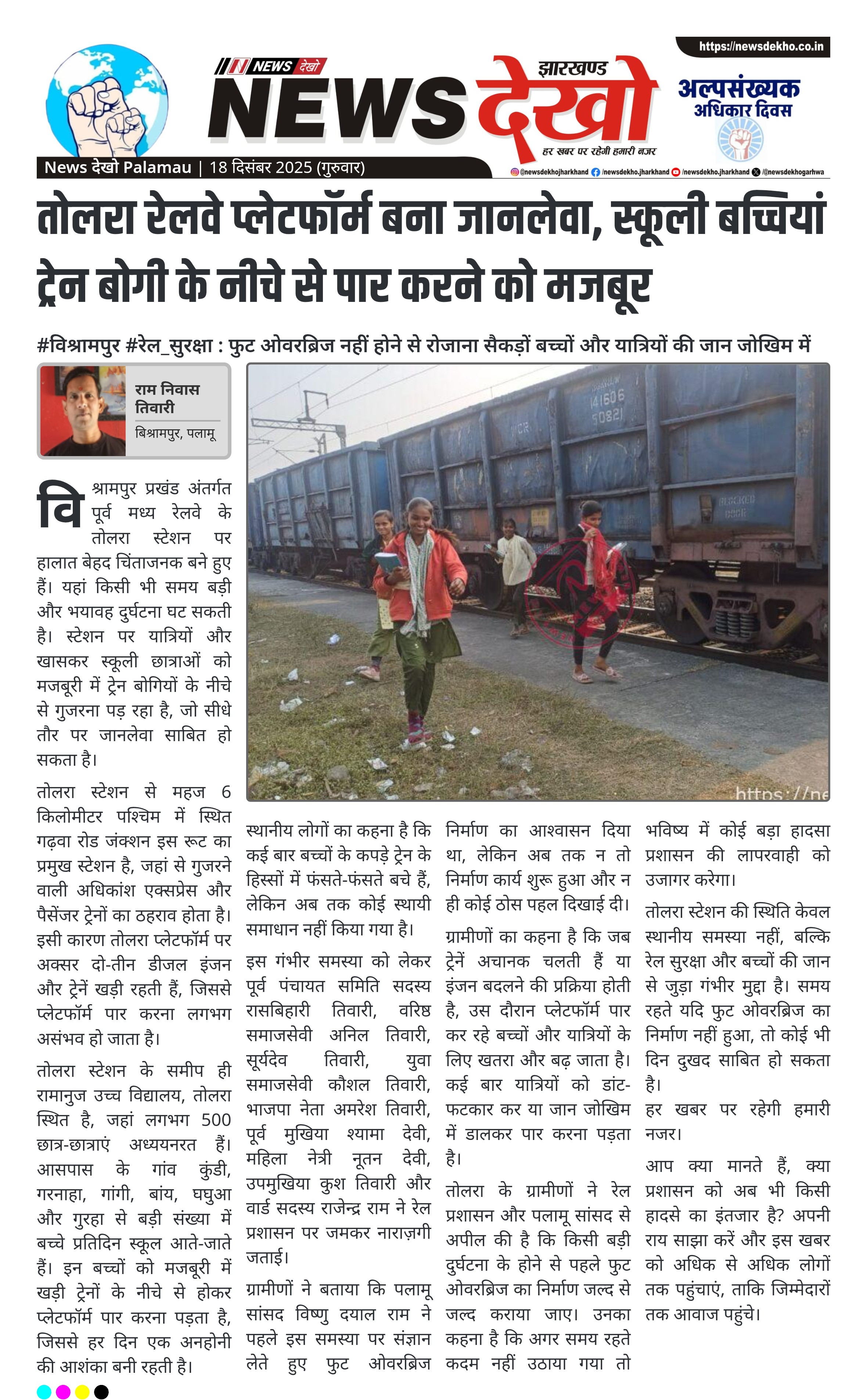 #विश्रामपुर #रेल_सुरक्षा : फुट ओवरब्रिज नहीं होने से रोजाना सैकड़ों बच्चों और यात्रियों की जान जोखिम में तोलरा स्टेशन पर खड़ी ट्रेनों के नीचे से लोग और स्कूली बच्चियां कर रही हैं आवागमन। पास ही स्थित रामानुज उच्च विद्यालय तोलरा में पढ़ते हैं लगभग 500 छात्र-छात्राएं। गढ़वा रोड जंक्शन नजदीक होने से प्लेटफॉर्म पर अक्सर खड़ी रहती हैं कई डीजल ट्रेनें। फुट ओवरब्रिज निर्माण का आश्वासन मिलने के बावजूद अब तक काम शुरू नहीं। ग्रामीणों और जनप्रतिनिधियों ने रेल प्रशासन…