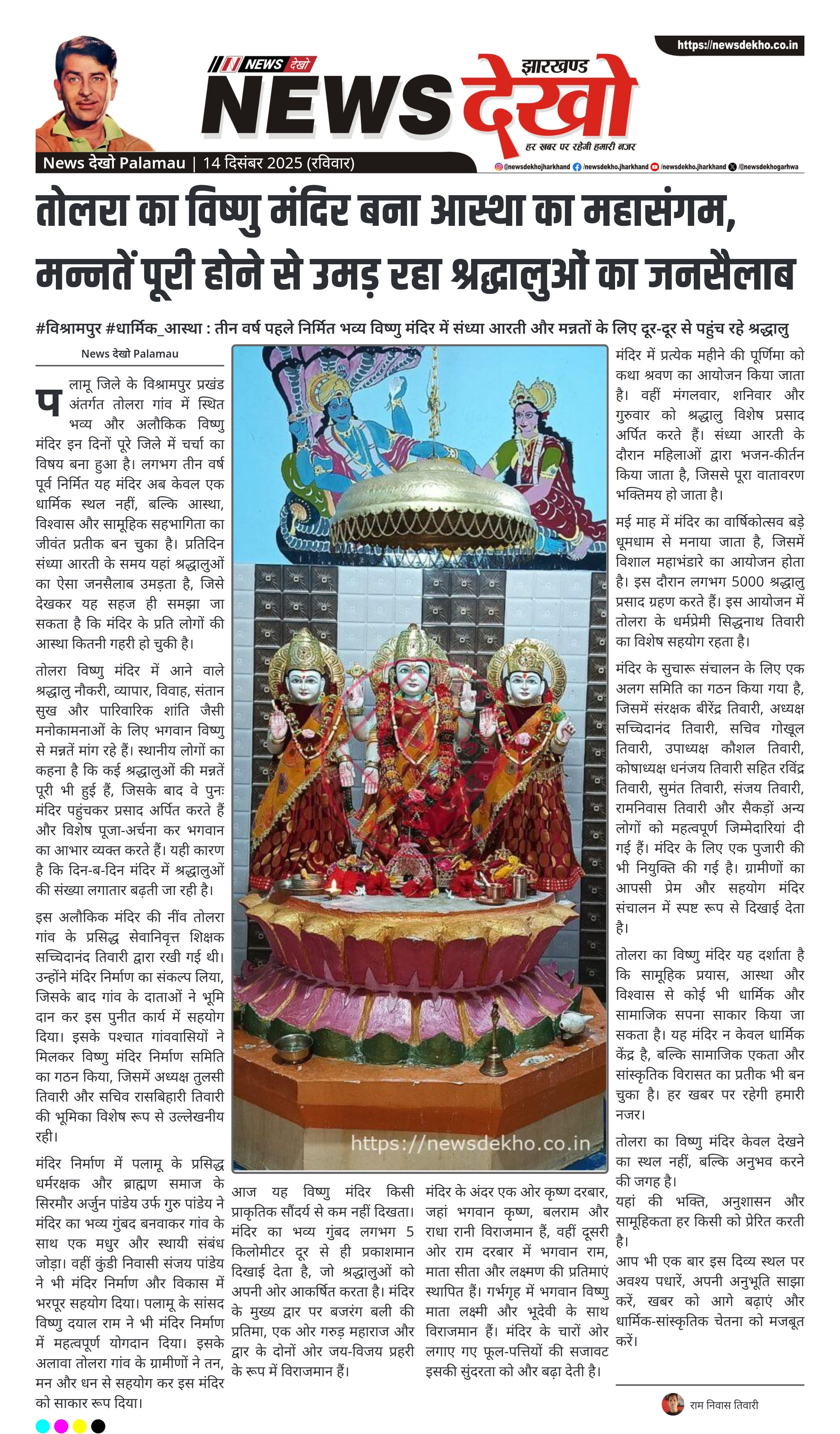 #विश्रामपुर #धार्मिक_आस्था : तीन वर्ष पहले निर्मित भव्य विष्णु मंदिर में संध्या आरती और मन्नतों के लिए दूर-दूर से पहुंच रहे श्रद्धालु तोलरा गांव का विष्णु मंदिर पलामू में आस्था का केंद्र बना। नौकरी, व्यापार, विवाह और संतान के लिए मांगी जा रही मन्नतें। मन्नत पूरी होने पर प्रसाद और विशेष पूजा का आयोजन। संध्या आरती में प्रतिदिन उमड़ती है भारी भीड़। मंदिर निर्माण में ग्रामीणों, दानदाताओं और जनप्रतिनिधियों का योगदान। पलामू जिले के विश्रामपुर प्रखंड अंतर्गत तोलरा गांव में…