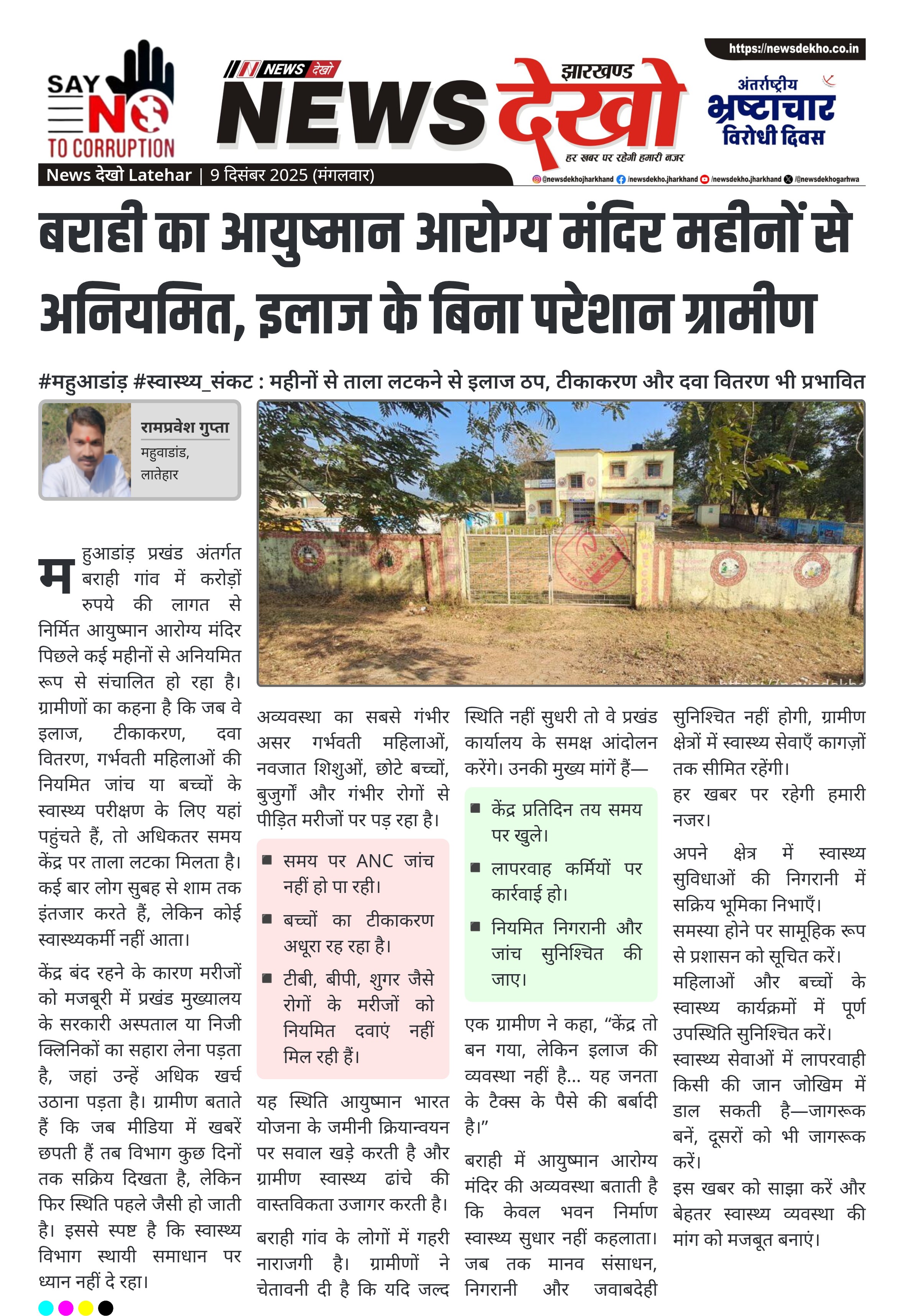 #महुआडांड़ #स्वास्थ्य_संकट : महीनों से ताला लटकने से इलाज ठप, टीकाकरण और दवा वितरण भी प्रभावित करोड़ों की लागत से बना केंद्र महीनों से अनियमित। ग्रामीण इलाज, दवा, टीकाकरण के लिए भटकने को मजबूर। समय पर गर्भवती महिलाओं की जांच और बच्चों का टीकाकरण प्रभावित। स्वास्थ्य विभाग की अस्थायी सक्रियता, स्थायी समाधान अभी नहीं। सुधार न होने पर ग्रामीणों ने आंदोलन की चेतावनी दी। महुआडांड़ प्रखंड अंतर्गत बराही गांव में करोड़ों रुपये की लागत से निर्मित आयुष्मान आरोग्य मंदिर पिछले…