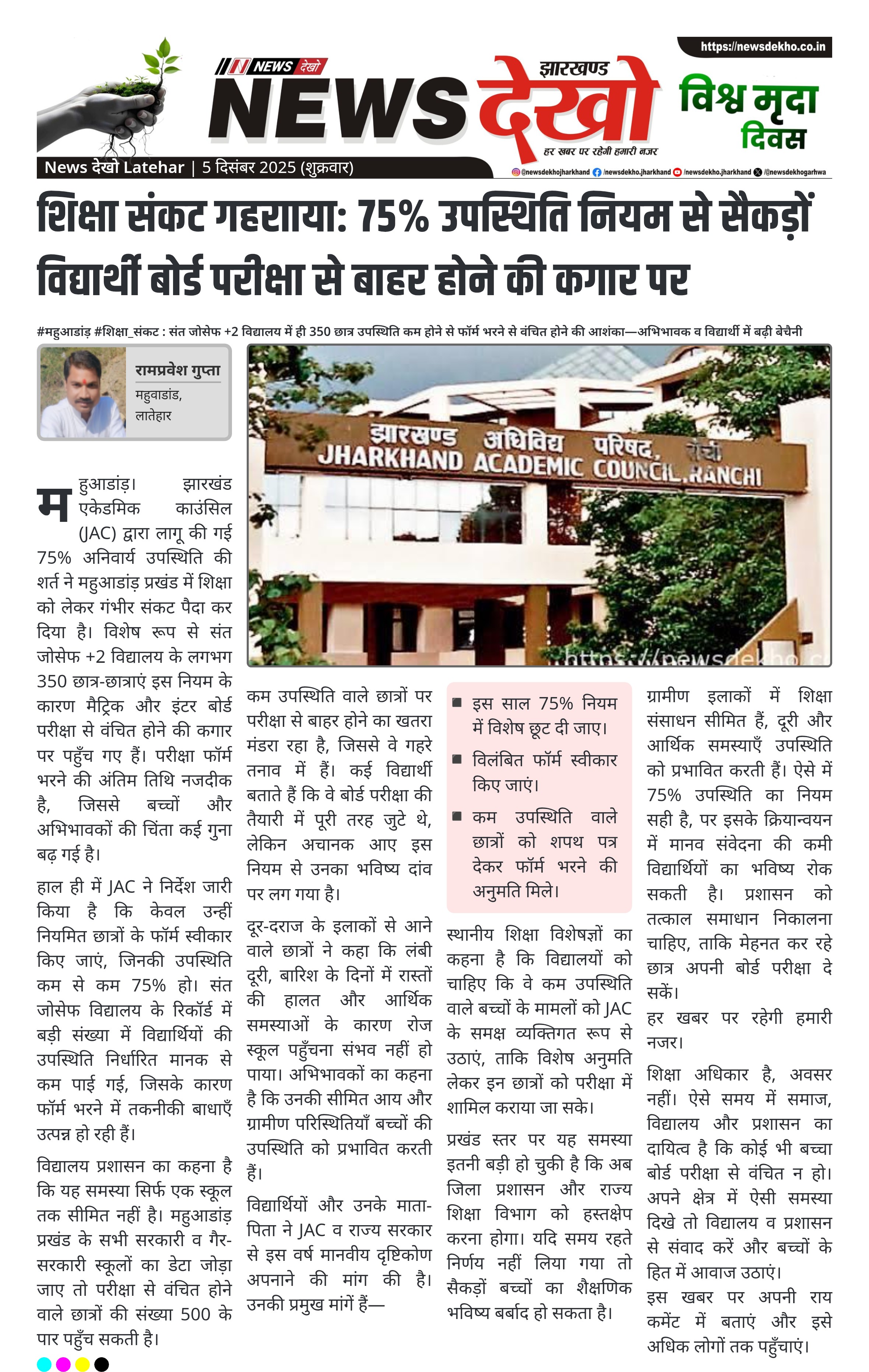 #महुआडांड़ #शिक्षा_संकट : संत जोसेफ +2 विद्यालय में ही 350 छात्र उपस्थिति कम होने से फॉर्म भरने से वंचित होने की आशंका—अभिभावक व विद्यार्थी में बढ़ी बेचैनी JAC के 75% उपस्थिति नियम से मैट्रिक–इंटर के सैकड़ों छात्रों पर परीक्षा न देने का खतरा। संत जोसेफ +2 विद्यालय, महुआडांड़ में करीब 350 विद्यार्थी फॉर्म भरने से वंचित। पूरे प्रखंड में यह संख्या 500 से अधिक होने का अनुमान। दूर-दराज के गाँव व आर्थिक दिक्कतें—कम उपस्थिति की प्रमुख वजह। विद्यार्थी–अभिभावक में तनाव,…
