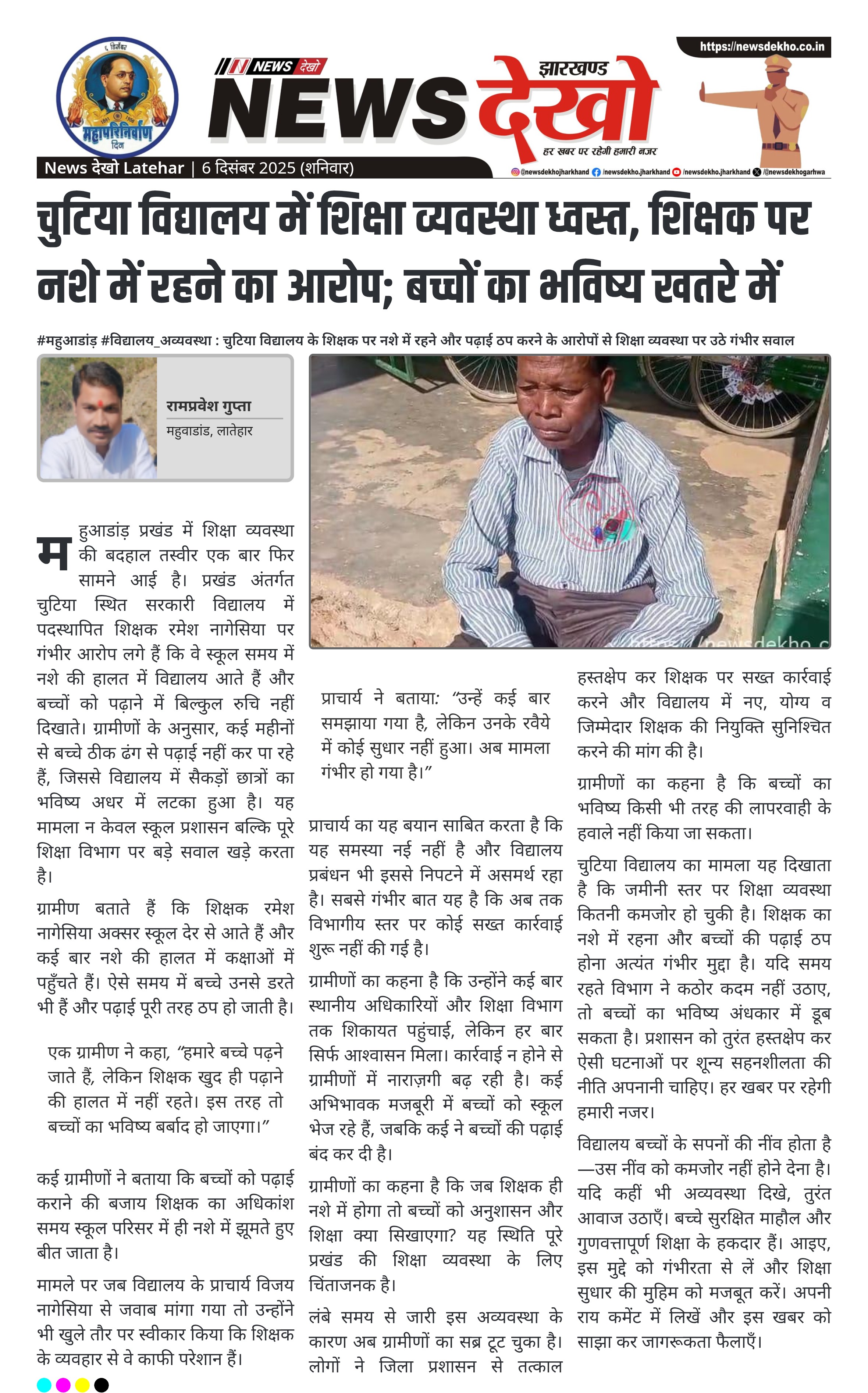 #महुआडांड़ #विद्यालय_अव्यवस्था : चुटिया विद्यालय के शिक्षक पर नशे में रहने और पढ़ाई ठप करने के आरोपों से शिक्षा व्यवस्था पर उठे गंभीर सवाल चुटिया विद्यालय के शिक्षक रमेश नागेसिया पर स्कूल समय में नशे की हालत में रहने का आरोप। ग्रामीणों का कहना—शिक्षक न समय पर आते, न पढ़ाते, कई बार धुत अवस्था में दिखे। विद्यालय के प्राचार्य विजय नागेसिया ने भी शिक्षक के रवैये से परेशान होने की बात स्वीकार की। सैकड़ों बच्चे पढ़ाई से वंचित, शिक्षा व्यवस्था…