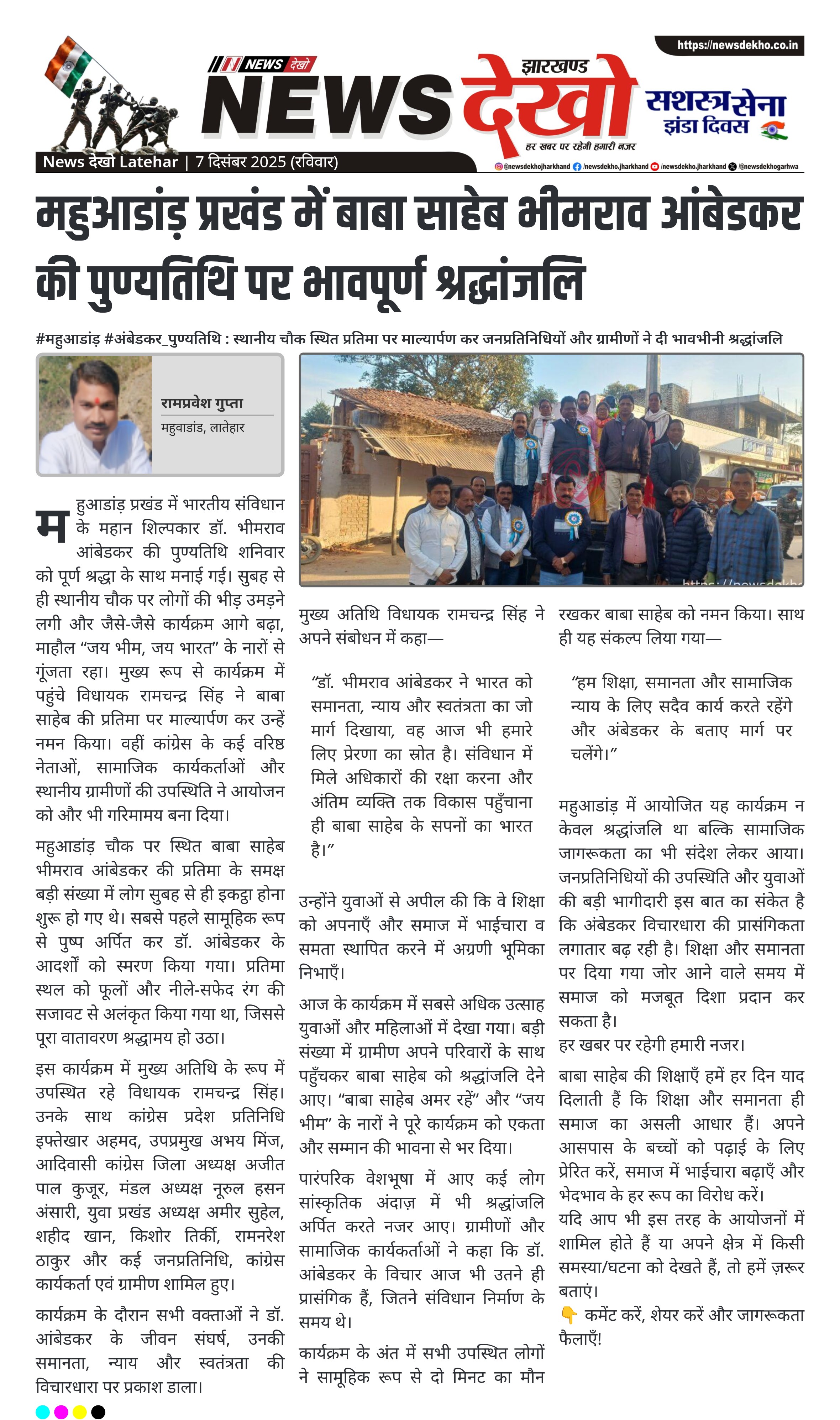 #महुआडांड़ #अंबेडकर_पुण्यतिथि : स्थानीय चौक स्थित प्रतिमा पर माल्यार्पण कर जनप्रतिनिधियों और ग्रामीणों ने दी भावभीनी श्रद्धांजलि महुआडांड़ प्रखंड में डॉ. आंबेडकर की पुण्यतिथि श्रद्धापूर्वक मनाई गई। स्थानीय चौक पर बाबा साहेब की प्रतिमा पर माल्यार्पण किया गया। कार्यक्रम में विधायक रामचन्द्र सिंह सहित कई जनप्रतिनिधि उपस्थित। सभी वक्ताओं ने समता, न्याय और शिक्षा को आगे बढ़ाने का संकल्प लिया। पूरा वातावरण “बाबा साहेब अमर रहें” के नारों से गूंज उठा। महुआडांड़ प्रखंड में भारतीय संविधान के महान शिल्पकार डॉ.…