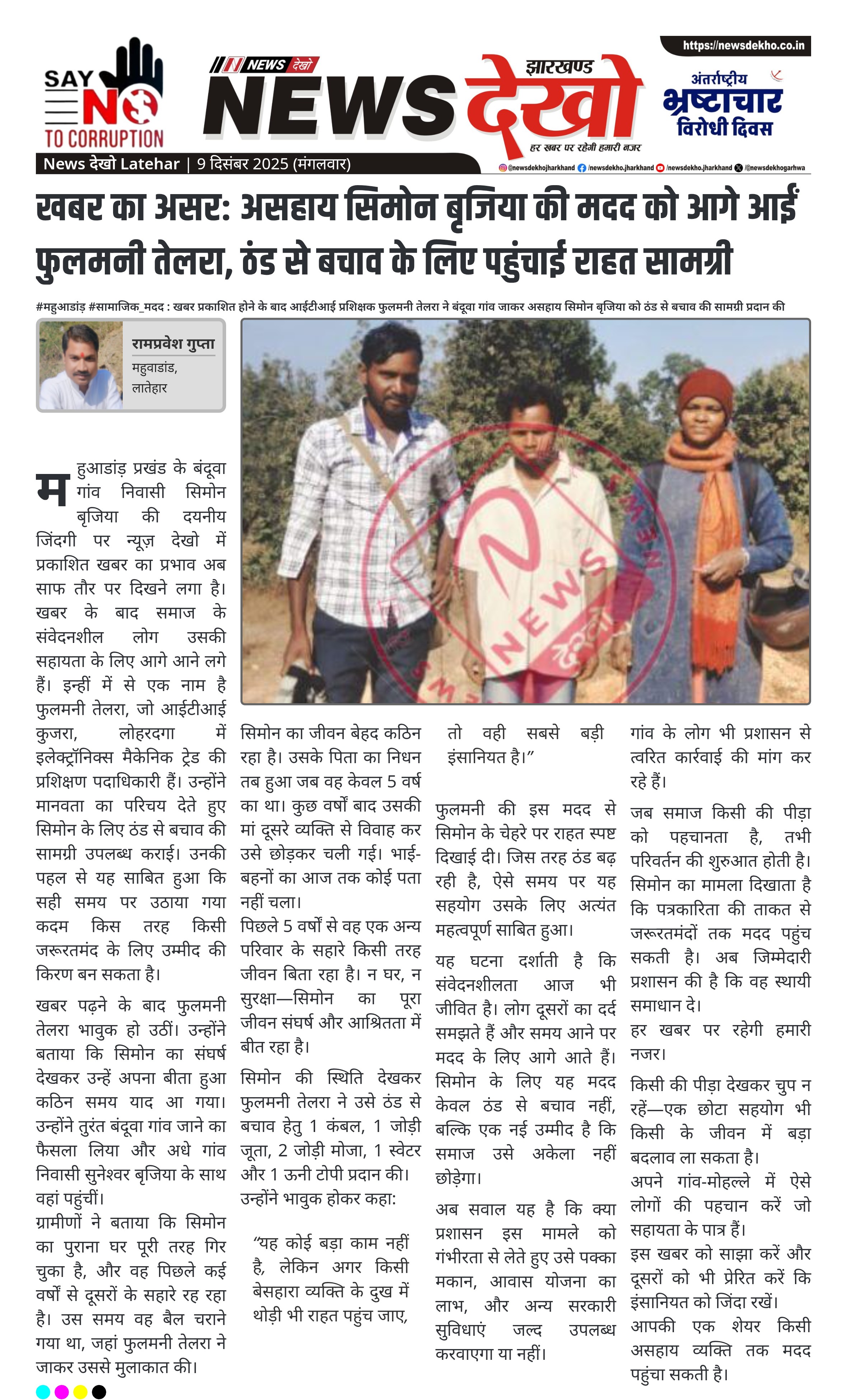 #महुआडांड़ #सामाजिक_मदद : खबर प्रकाशित होने के बाद आईटीआई प्रशिक्षक फुलमनी तेलरा ने बंदूवा गांव जाकर असहाय सिमोन बृजिया को ठंड से बचाव की सामग्री प्रदान की बंदूवा गांव के सिमोन बृजिया की पीड़ा पर प्रकाशित खबर का असर। फुलमनी तेलरा निजी स्तर पर मदद लेकर पहुंचीं। सिमोन को कंबल, जूते, मोजे, स्वेटर व ऊनी टोपी भेंट की गई। सिमोन बिना माता-पिता, बिना घर—दूसरों पर आश्रित होकर जीवन गुजार रहा है। समाज के संवेदनशील लोगों में मदद को लेकर सकारात्मक…