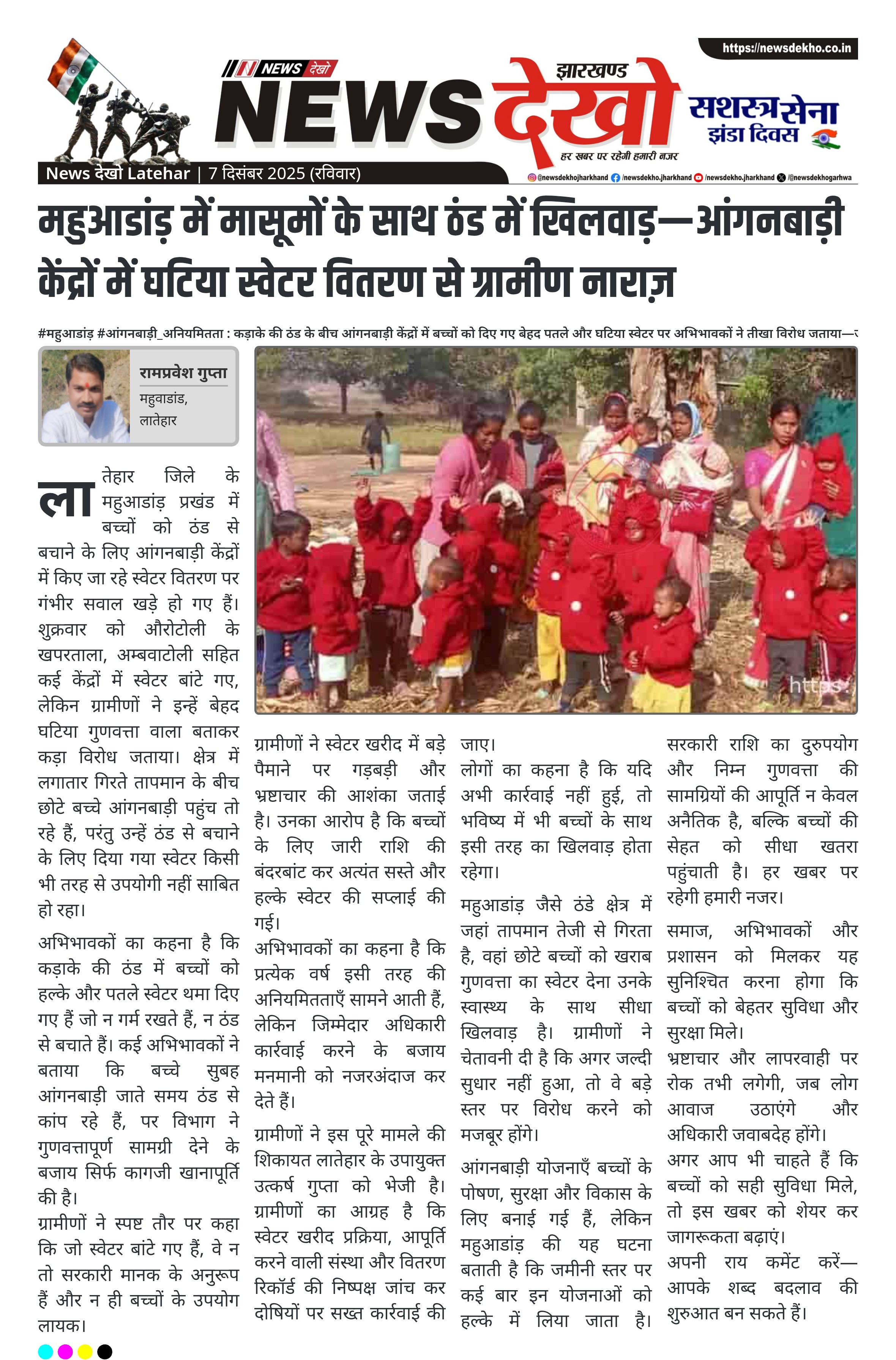 #महुआडांड़ #आंगनबाड़ी_अनियमितता : कड़ाके की ठंड के बीच आंगनबाड़ी केंद्रों में बच्चों को दिए गए बेहद पतले और घटिया स्वेटर पर अभिभावकों ने तीखा विरोध जताया—जांच की मांग तेज। कई आंगनबाड़ी केंद्रों में बच्चों को बेहद पतले स्वेटर मिले। खपरताला, अम्बवाटोली सहित कई टोलों में वितरण के बाद विरोध। अभिभावकों का आरोप—ठंड में किसी काम के नहीं ये स्वेटर। ग्रामीणों ने स्वेटर खरीद में अनियमितता व भ्रष्टाचार का संदेह जताया। उपायुक्त उत्कर्ष गुप्ता से निष्पक्ष जांच की मांग जोर पकड़…
