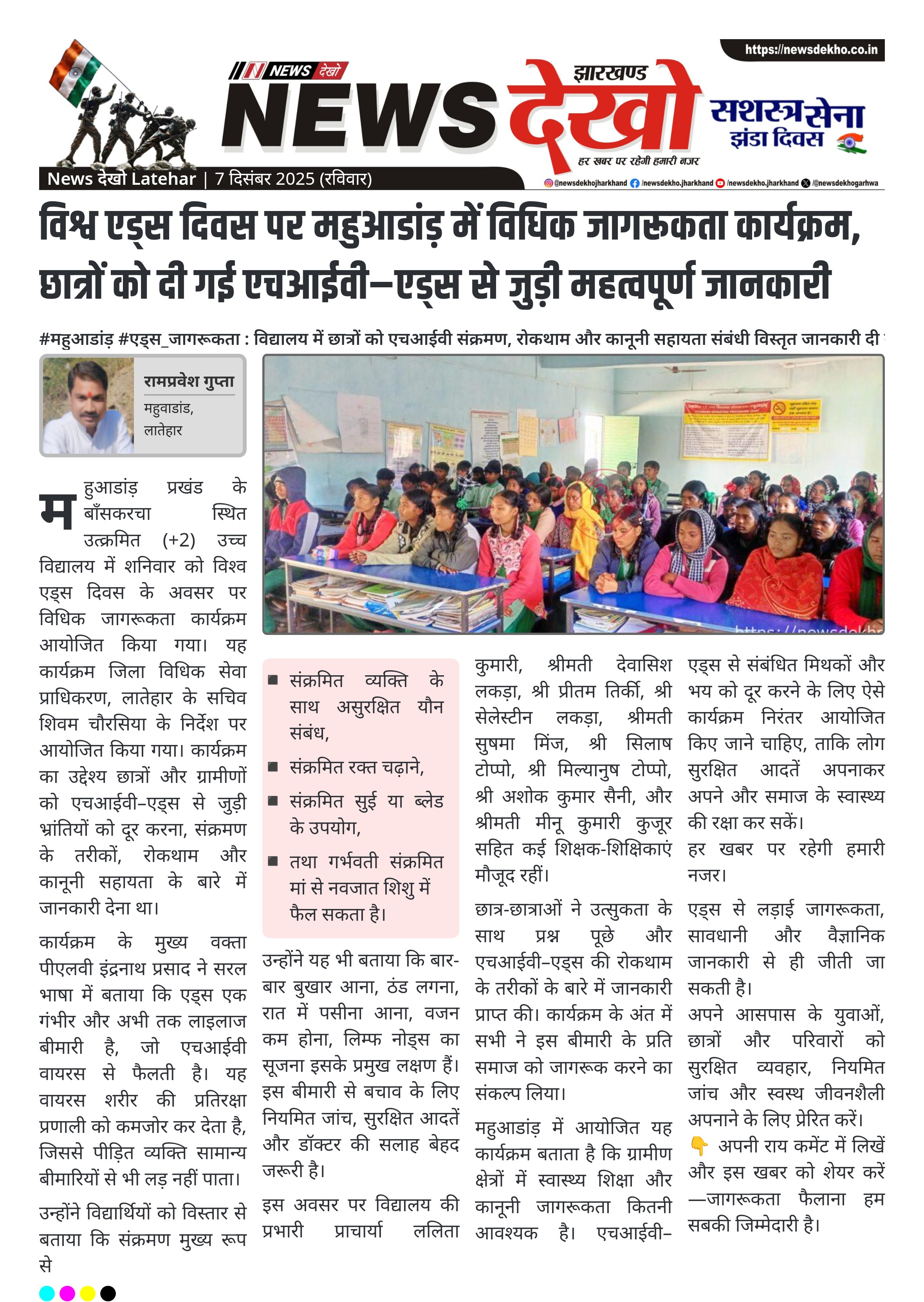 #महुआडांड़ #एड्स_जागरूकता : विद्यालय में छात्रों को एचआईवी संक्रमण, रोकथाम और कानूनी सहायता संबंधी विस्तृत जानकारी दी गई विश्व एड्स दिवस पर महुआडांड़ में जागरूकता कार्यक्रम आयोजित। उत्क्रमित +2 उच्च विद्यालय बाँसकरचा में छात्रों को विस्तृत जानकारी दी गई। कार्यक्रम जिला विधिक सेवा प्राधिकरण लातेहार के निर्देश पर हुआ। पीएलवी इंद्रनाथ प्रसाद ने एचआईवी–एड्स के लक्षण, कारण और रोकथाम समझाई। विद्यालय की प्रभारी प्राचार्या ललिता कुमारी सहित कई शिक्षक-शिक्षिकाएं उपस्थित। महुआडांड़ प्रखंड के बाँसकरचा स्थित उत्क्रमित (+2) उच्च विद्यालय में…