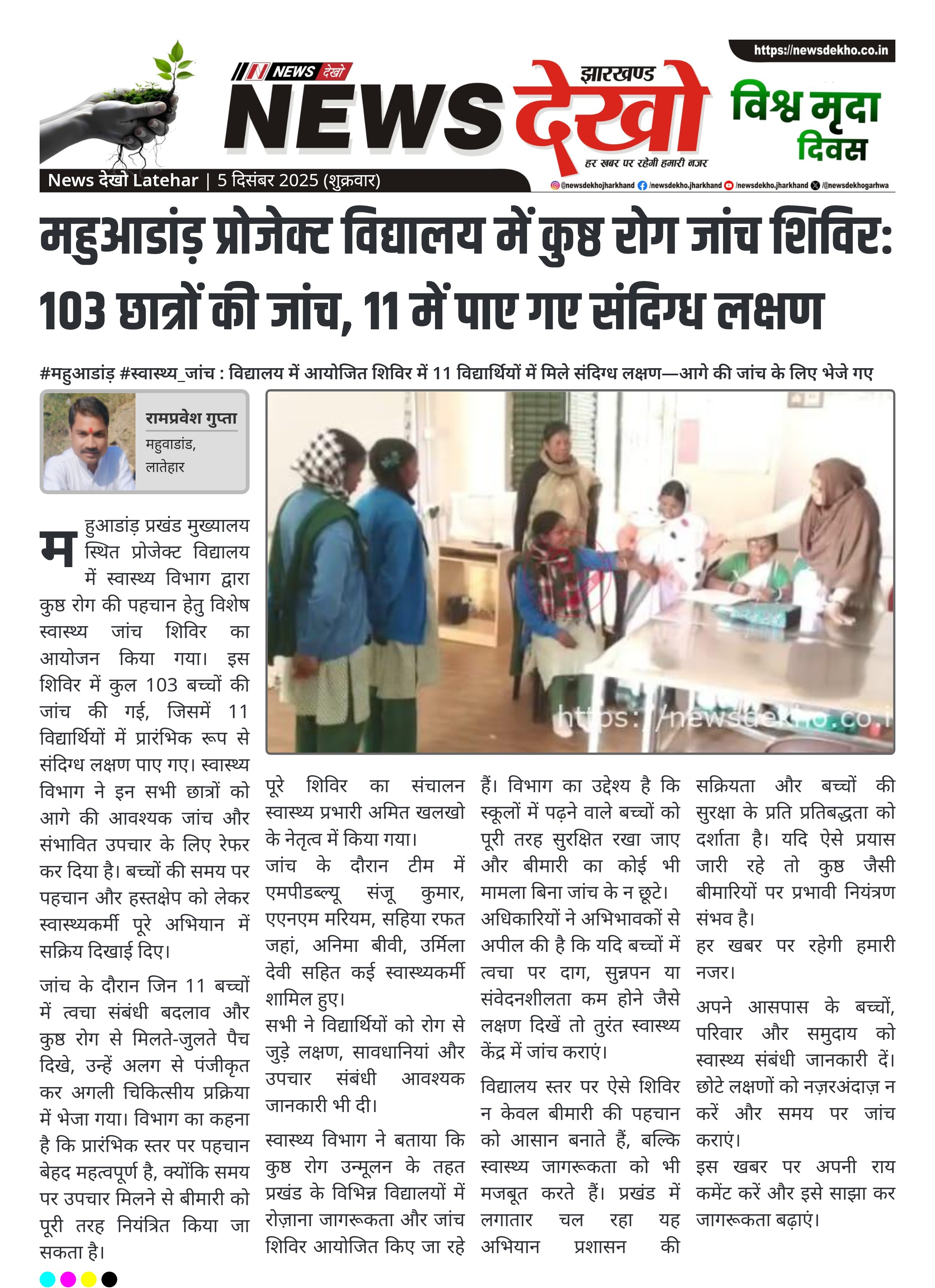 #महुआडांड़ #स्वास्थ्य_जांच : विद्यालय में आयोजित शिविर में 11 विद्यार्थियों में मिले संदिग्ध लक्षण—आगे की जांच के लिए भेजे गए प्रोजेक्ट विद्यालय, महुआडांड़ में कुष्ठ रोग जांच शिविर का आयोजन। कुल 103 छात्र-छात्राओं की स्वास्थ्य जांच की गई। 11 विद्यार्थियों में कुष्ठ रोग के संदिग्ध लक्षण पाए गए। सभी संदिग्ध बच्चों को अतिरिक्त परीक्षण के लिए भेजा गया। जांच अभियान स्वास्थ्य प्रभारी अमित खलखो के निर्देशन में संचालित। कई स्वास्थ्यकर्मी और सहिया टीमें रही सक्रिय। महुआडांड़ प्रखंड मुख्यालय स्थित प्रोजेक्ट…