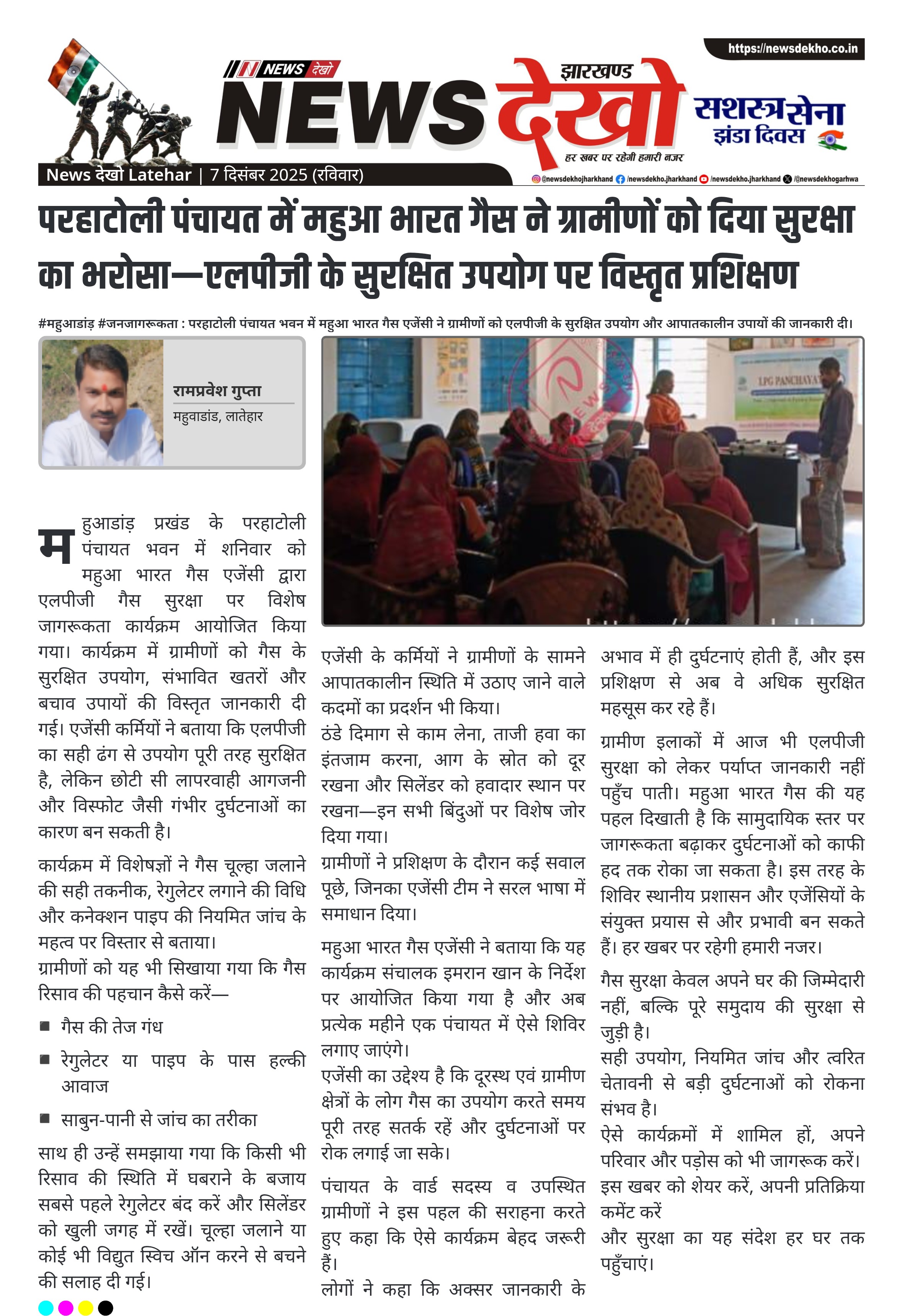 #महुआडांड़ #जनजागरूकता : परहाटोली पंचायत भवन में महुआ भारत गैस एजेंसी ने ग्रामीणों को एलपीजी के सुरक्षित उपयोग और आपातकालीन उपायों की जानकारी दी। ग्रामीणों को एलपीजी सुरक्षा, रिसाव पहचान और बचाव उपाय बताए गए। रेगुलेटर, पाइप व चूल्हे की जांच प्रक्रिया समझाई गई। आपातकालीन स्थिति में उठाए जाने वाले कदमों का प्रदर्शन किया गया। कार्यक्रम महुआ भारत गैस के संचालक इमरान खान के निर्देश पर हुआ। एजेंसी कर्मी सदिकुल, वार्ड सदस्य और ग्रामीण बड़ी संख्या में मौजूद। महुआडांड़ प्रखंड…